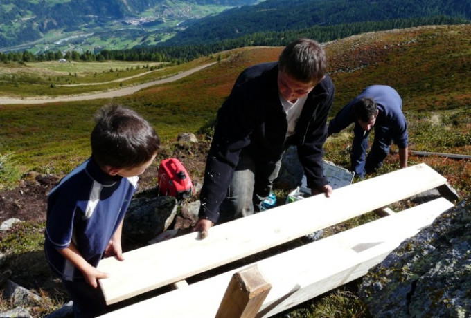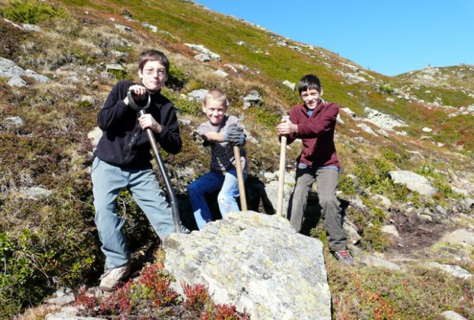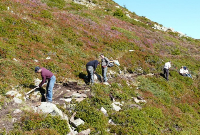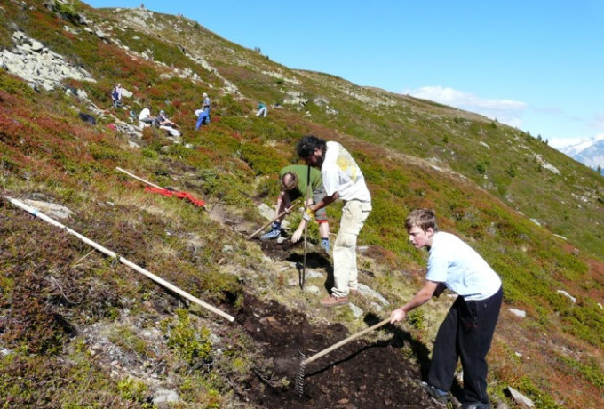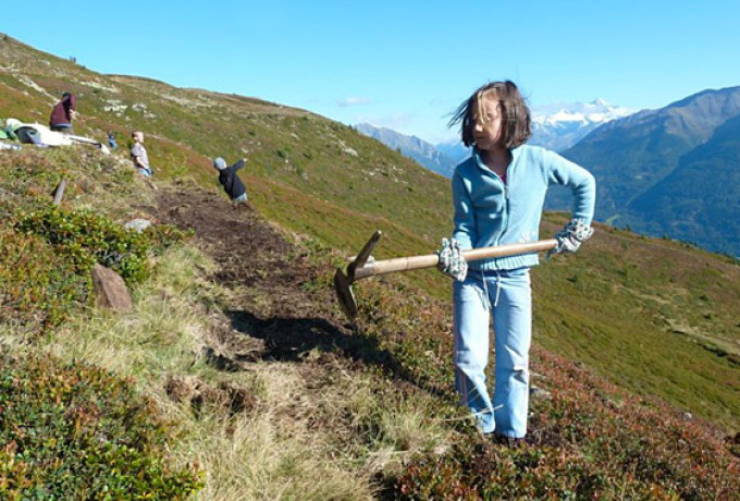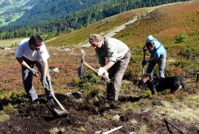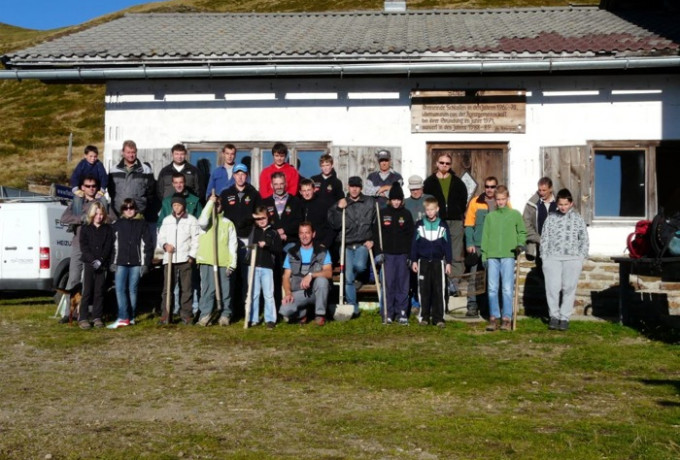 Mit Schaufel, Pickel, Haue, Eisenrechen, Rennstange und anderem Werkzeug bewaffnet starteten 33 engagierte Schlaitner am 11. September vom Dorfplatz mit dem Traktor in Richtung Schlaitner Tor. Zweck der Expedition: die gemeinsame Sanierung des Wandersteiges von der Schlaitner Torhütte bis zum Gipfelkreuz am Moschumandl.