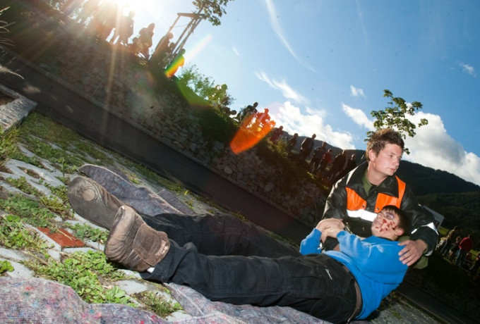 Pressefotograf Philipp Brunner hat in beeindruckenden Bildern festgehalten, wie realitätsnahe die fiktive Katastrophe inszeniert wurde. Bis in die Nacht hinein kämpften die Teilnehmer dieses Rotkreuz-Seminars für Katastrophenhelfer bei Kälte und Regen um das Leben von Verletzten, die Bergung von Verunglückten und die Aufrechterhaltung von Sicherheit.