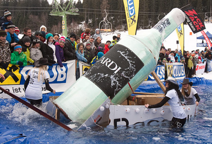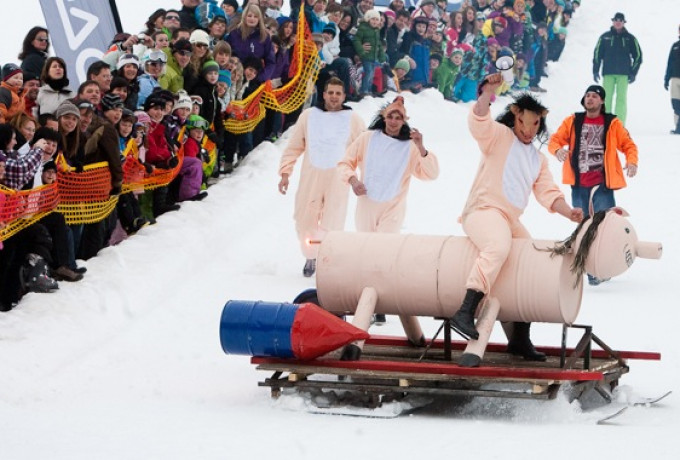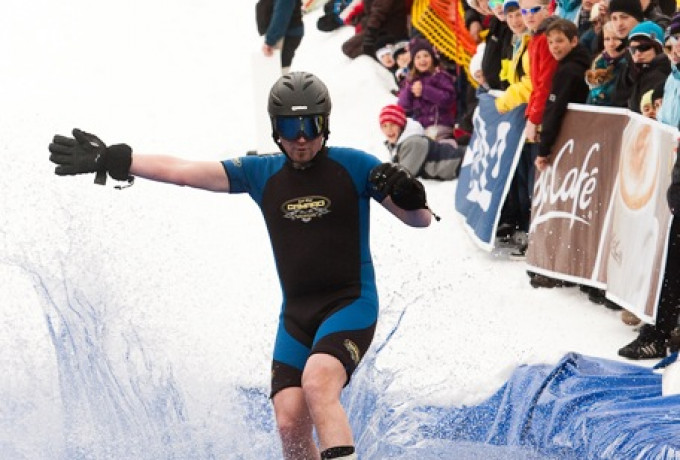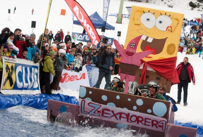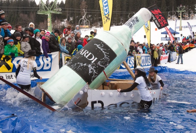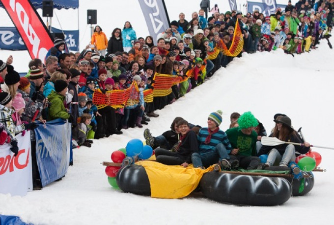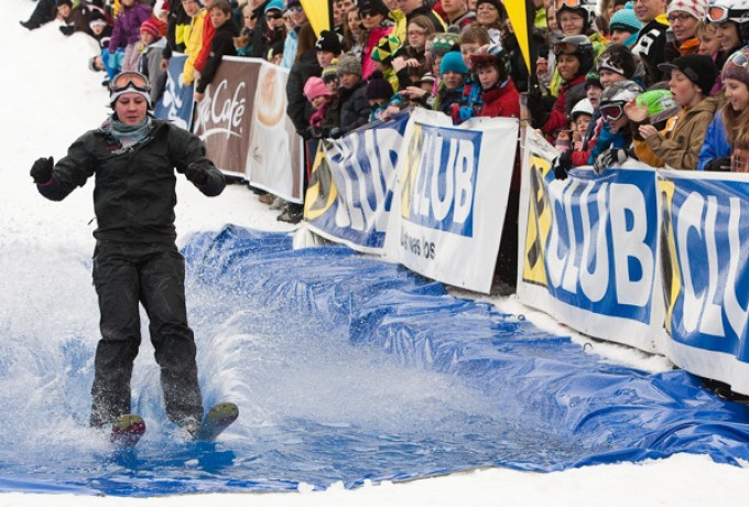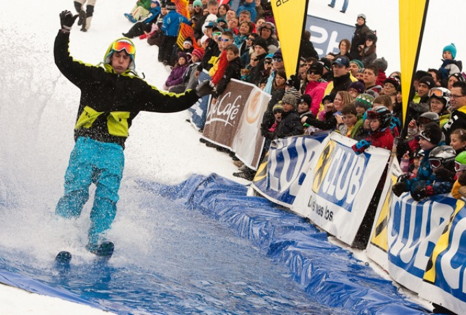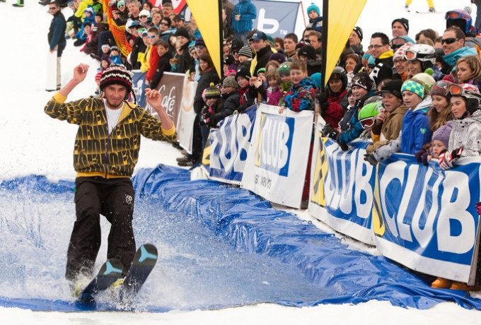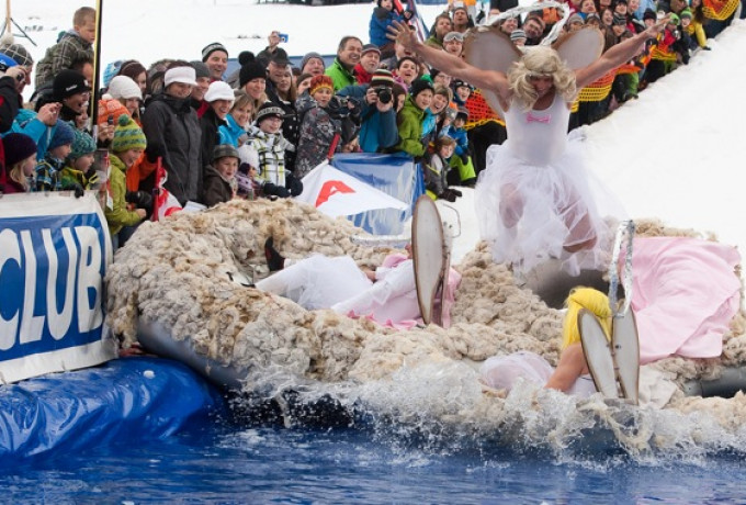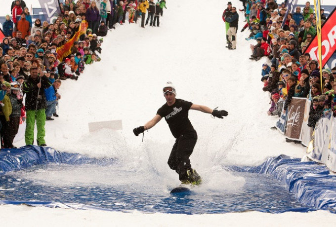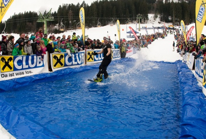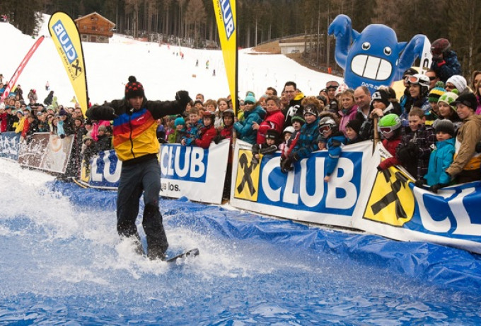 Mit Skiern und Snowboard über´s Wasser "sliden", hochspringen, am Gummiseil ziehen und im Heu nach Geschenken wühlen, beobachtet von tausenden Zusehern – das klingt nach Riesengaudi und war auch eine. Das "Beck'n-fleck'n", seit Jahren Brauch im winterlichen Defereggental, wurde heuer von den Lienzer Bergbahnen erstmals auf der Moosalm inszeniert.