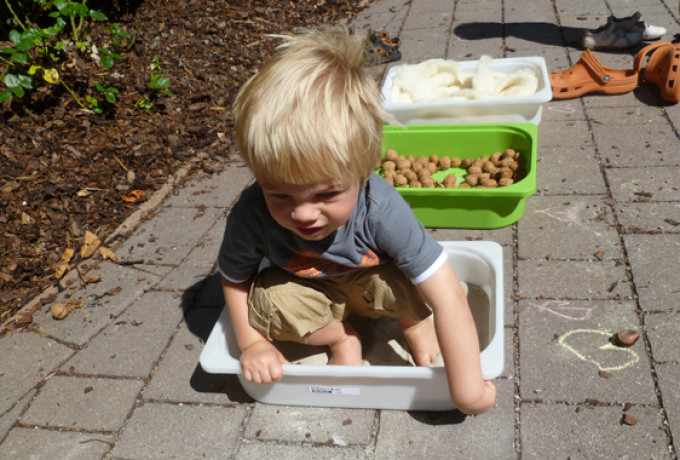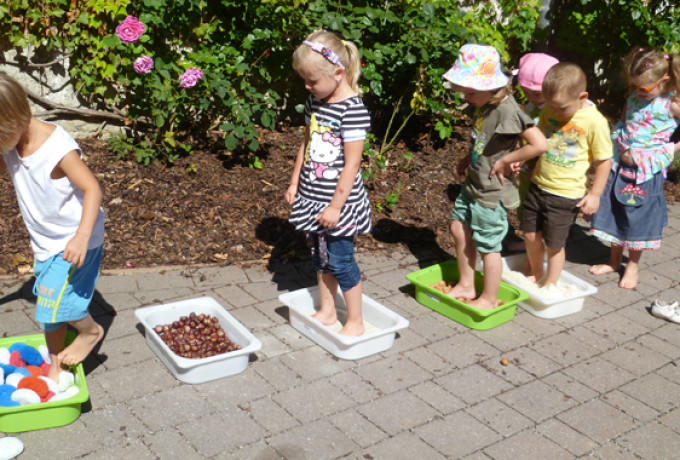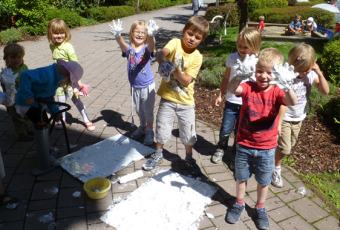 Sie ließen Vulkanberge ausbrechen, grillten ihre Würstchen über heißer Kohle und genossen selbstgebackenes Brot. Ein feucht-fröhliches Erlebnis stellte das Element Wasser dar. Es wurde ausgiebig geplanscht und es entstanden Staudämme und kleine Seen, auf denen die Kinder ihre selbst gebastelten Eierkartonboote schwimmen ließen. Die Leichtigkeit der Luft wurde mit bunten Tanzbändern sichtbar gemacht. Die Kraft der Erde erlebten die kleinen Forscher und Forscherinnen beim Experimentieren mit Sand, Ton und Stein.