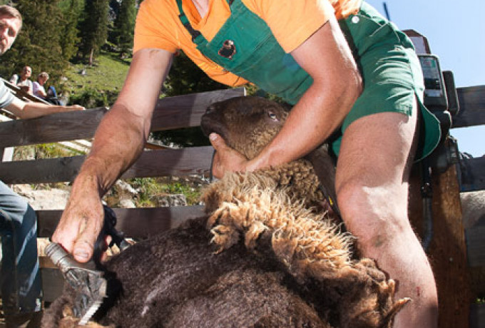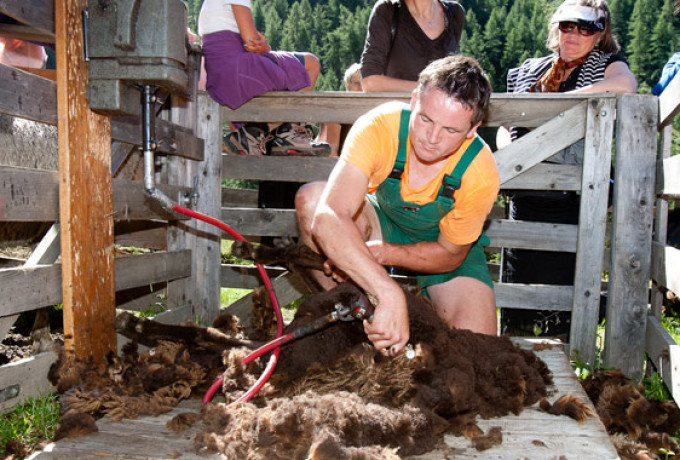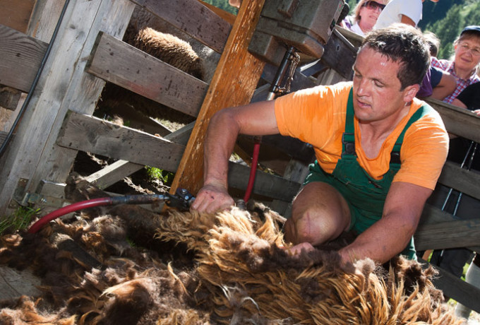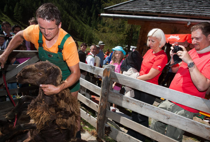 Ein besonderes Erlebnis für alle Besucher war der Blick über die Schulter des Schafscherers, der die Tiere mit viel Geschick und der nötigen Kraft von ihrer "Wolle" befreite und ihnen eine luftige Herbstfrisur verpasste. Am Nachmittag wurde eine Messe in der Kapelle der Oberstoller Alm von Kaplan Albrecht Tagger abgehalten.