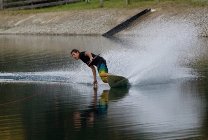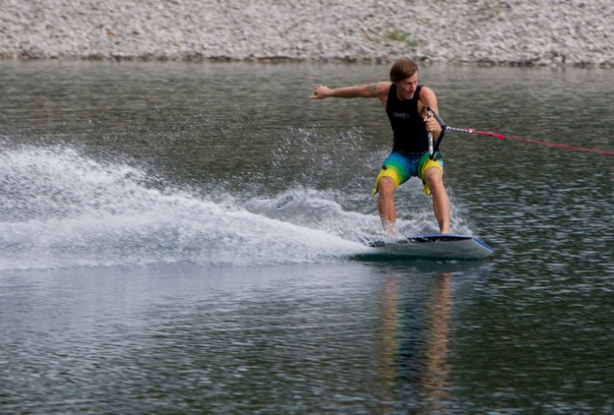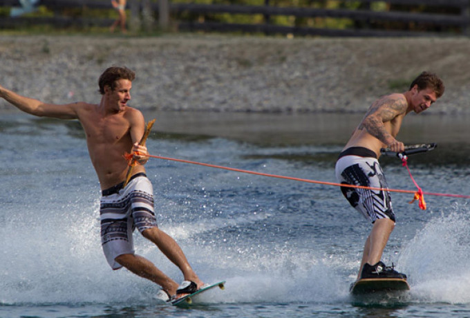 Wakeboarder schlagen Wellen im Speicherteich