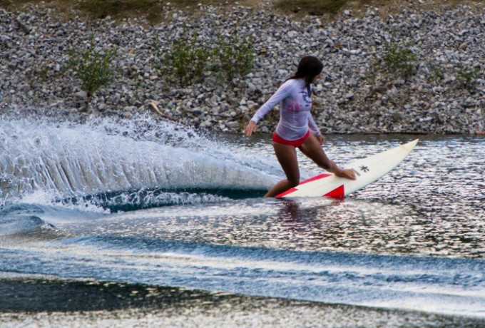 Das Seil, an dem die Wakeboarder hängen, wird von einem motorbetriebenen Winde rasant eingezogen, ein Gashebel reguliert das Tempo. Wenn man´s kann, macht die Geschichte – so wie´s ausschaut – richtig Spaß. Weniger lustig wäre laut Bürgermeisterin Elisabeth Blanik, wenn die teure und empfindliche Folie reißen würde, die das Versickern des Wassers im Teich verhindert.