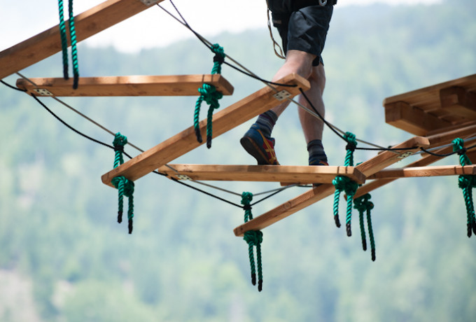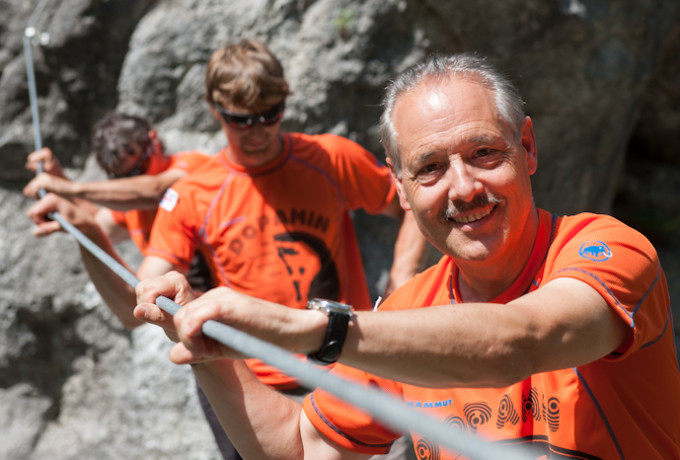Neben den neuen Parkelementen ergänzen zwei weitere Klettersteige künftig das Kraxlerangebot in der Klamm, einer davon ist für Familien angelegt, den zweiten nennen seine Schöpfer "Dopamin", vermutlich weil schwindelfreie Kletterer auf einem Seil in schwindelerregender Höhe über der Klamm dieses "Glückshormon" ausschütten. Theurl und Co. probierten den Effekt vor der Kamera von Dang Tran, der auch sonst allerhand inspirierende Szenen im erweiterten Erlebnispark einfing.