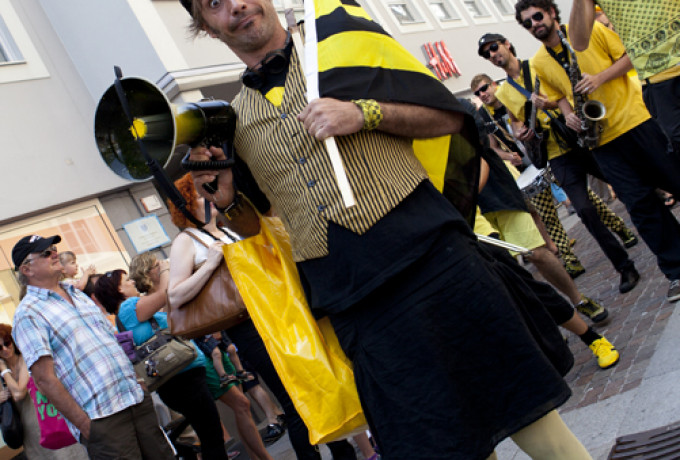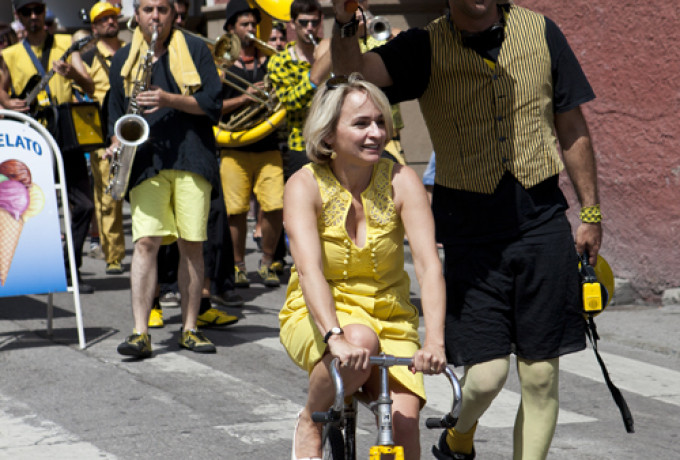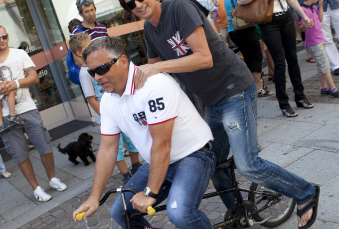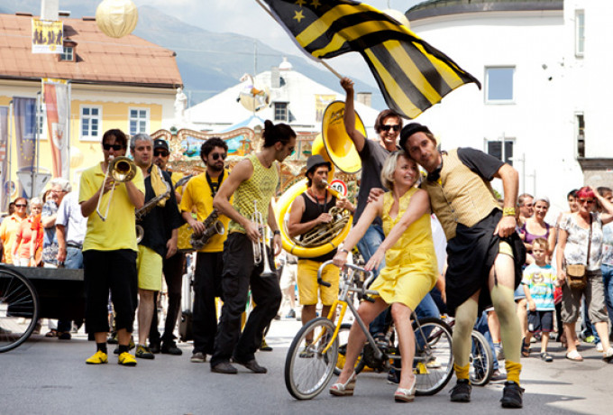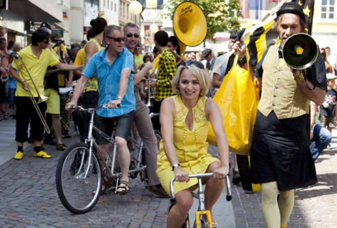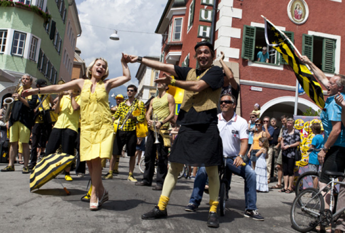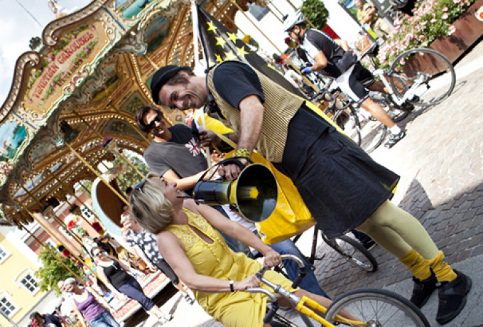 Unverwüstlich zog die beliebte Always Drinking Marching Band durch die Straßen, doch etwas war anders: Plötzlich setzte sich eine gut gelaunte Frau in passendem Outfit auf einem Rad an die Spitze des Orchesters: Bürgermeisterin Elisabeth Blanik. Auch die Stadträte Christian Zanon und Charly Kashofer ließen sich den Spaß nicht nehmen, begleitet vom schrägen Orchester auf kreativen Radkreationen von Mowetz & Co durch die Innenstadt zu strampeln. Blanik, die froh sein dürfte, sich ausnahmsweise dem Radsport in Lienz anstatt dem Schwimmsport in Matrei widmen zu können, zeigt sich begeistert von den lustigen Drahteseln: „Mit diesem Rad geht’s auf und ab, wie im richtigen Leben!“ erzählt sie Dolomitenstadt.