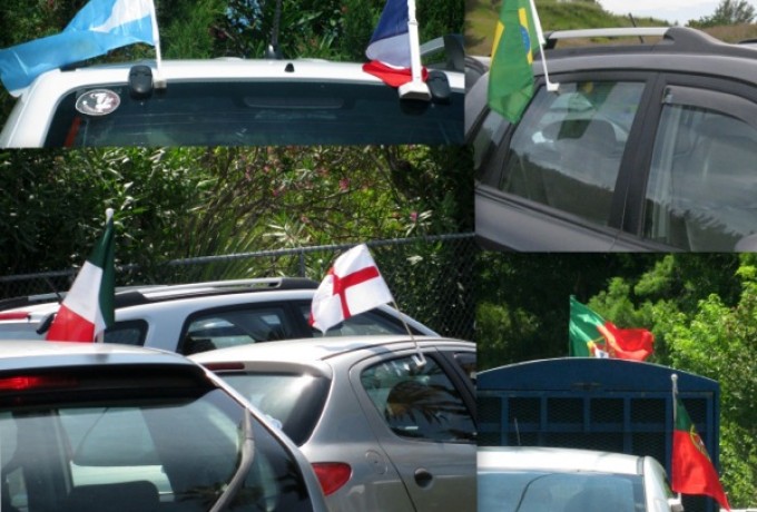 Manche Autobesitzer können sich gar nicht so richtig entscheiden, welches Team sie unterstützen sollen oder wollen und haben deshalb gleich mehrere unterschiedliche Nationalflaggen angeheftet. Das liegt wohl auch daran, dass viele Familien hier einfach international zusammengewürfelt sind. Der Nationalstolz, wenn es um Fußball geht, dann aber doch nicht unterdrückt bzw. überbrückt werden kann. Die WM-Wochen bringen hitzige Stimmung in die klimatisierten Pubs der Insel, wo sich Fans verschiedener Nationalitäten die Spiele auf übergroßen Bildschirmen ansehen und sich untereinander danach manchmal aufs Ärgste anfeinden.