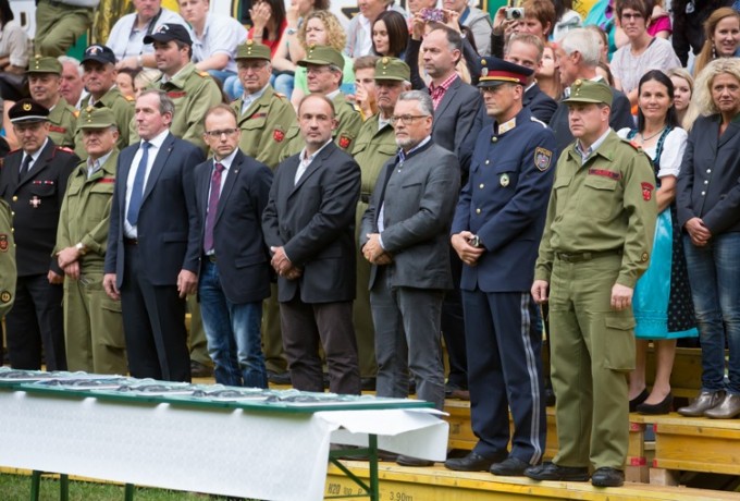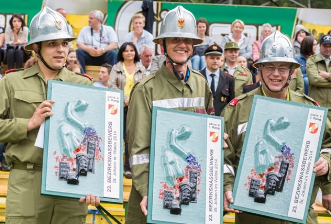 Bei der Schlussveranstaltung marschierten alle 57 angetretenen Gruppen gemeinsam mit der Musikkapelle St. Johann im Walde auf den Bewerbsplatz ein. Bezirkskommandant Herbert Oberhauser, Bürgermeister Franz Gollner und VP-Abgeordneter Hermann Kuenz fanden die passenden Worte, bevor die erfolgreichsten Gruppen ihre Trophäen in Empfang nahmen, angefertigt von Mitgliedern der FF St. Johann im Walde. Die Bezirksbewerbsfahne wurde eingeholt und den Mitgliedern der FF Obertilliach übergeben. Sie sind im nächsten Jahr an der Reihe.