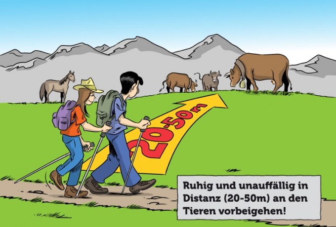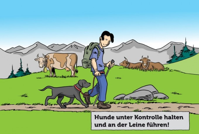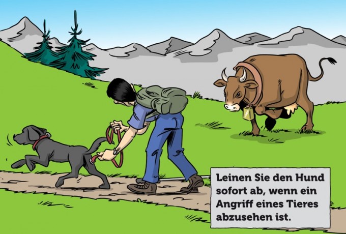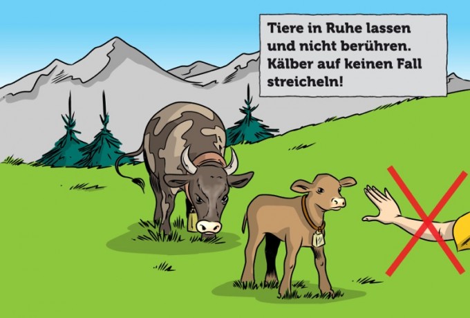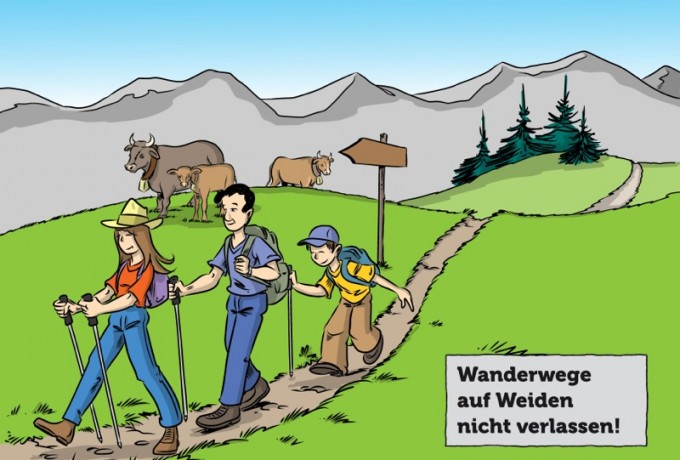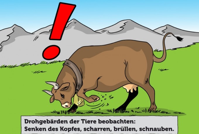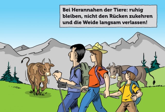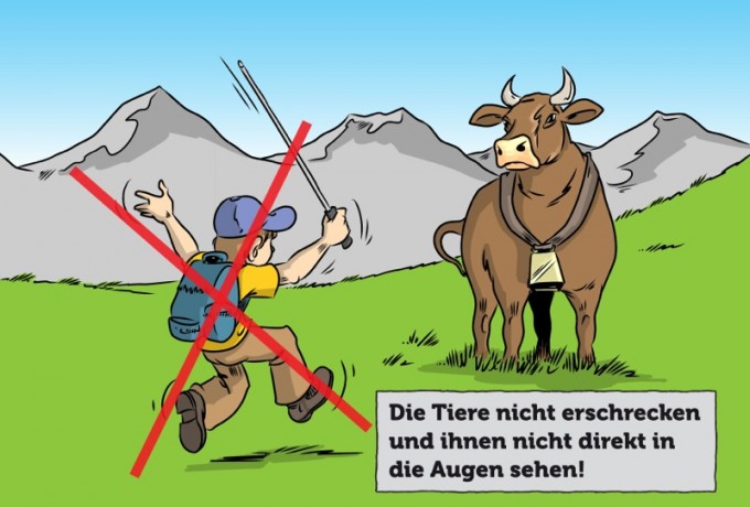 Nach dem tragischen Tod einer Urlauberin, die von Kühen attackiert worden war, präsentiert die Landwirtschaftskammer Tirol jetzt einen Infofolder, der auf leicht verständliche Aufklärung setzt. In Zusammenarbeit mit dem Almwirtschaftsverein, der Tirol Werbung und der Landesveterinärdirektion werden die wichtigsten Regeln plakativ als Cartoon dargestellt. Wir haben die Zeichnungen als Slideshow zusammengestellt, die auch auf dem Handy gut funktioniert.