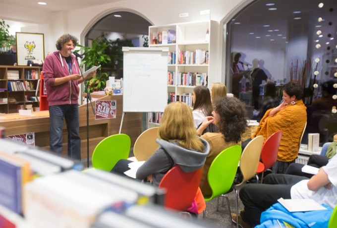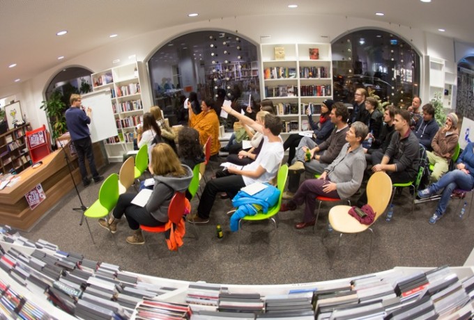 Bereits um 17 Uhr lud Abermann Interessierte Neo-Slammer zum gemeinsamen Workshop in die Räume der Stadtbücherei. Das Echo war eher mäßig, denn nur zwei Teilnehmer konnten sich durchringen, unter professioneller Anleitung zu schreiben und das für einen Poetry-Slam so wichtige Vortragen zu üben. Abermann und seine zwei „Schüler“ schufen dann aber in kurzer Zeit sehr interessante und beeindruckende Texte.