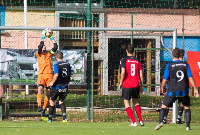 Zwei Minuten später hatten die Hausherren bei einer tollen Möglichkeit für die Gäste das Glück auf ihrer Seite. Sandro Stresch brachte einen Freistoß zu dem auf der zweiten Stange lauernden Juro Kovacic, doch dieser setzte den Ball völlig freistehend per Kopf neben das FC-WR Tor. Dann waren wieder die Gastgeber an der Reihe und zweimal hatte Aldamir da Silva das 2:0 am Fuß. Zunächst konnte sein Schuss nach Zuspiel von Tobias Jeller im letzten Moment noch zum Eckball abgeblockt werden und kurz darauf setzte er nach einem weiten Ball von Marcus Neunhäuserer das Spielgerät am Drautaler Kasten vorbei.