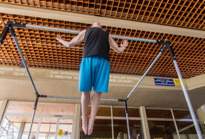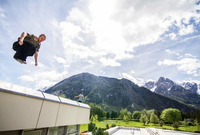 In der Schwimmhalle, wo jetzt die Umbauarbeiten beginnen, richteten sich fast 20 StyleFlyer ihren Spielplatz ein: Mit Reck, Matten, Sportgeräten und einer starken Musikanlage. Das ausgediente Dolomitenbad wurde kurz vor dem Beginn seiner Revitalisierung für einen Vormittag der wahr gewordene Traum für die jungen Sportler: Die Free-Runner maßen die Länge des Sportbeckens in Saltos und Überschlägen. Sprungsockel und Treppen waren Rampen für Sprünge. Selbst vor dem Dach machten die Styleflyer nicht halt.