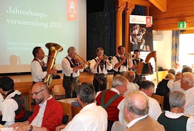 Anschließend lud der Tiroler Volksmusikverein nicht nur seine Mitglieder, sondern auch Freunde und Interessierte zur Jahreshauptversammlung in die Römerstube ein. Es war die erste Hauptversammlung in Osttirol. Obmann Peter Margreiter stellte den ca. 120 Anwesenden die Vorstandsmitglieder, Gebietsreferenten und die Mitglieder der Arbeitsgruppe Osttirol vor.
