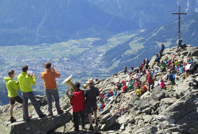 Pater Markus segnete nicht nur das Heimkehrerkreuz, sondern auch das neue 15 Meter hohe und 10 Meter breite Alukreuz, das zu diesem Zeitpunkt bereits wieder abgebaut war und künftig als „Friedenskreuz“ bezeichnet werden wird. Im Gedenken an jene verstorbenen Männer, die 1950 das Heimkehrerkreuz auf den Berg getragen und aufgebaut haben, wurden ihre Namen noch einmal genannt, bevor die fünfköpfige Bläsergruppe der Musikkapelle Oberlienz das Lied „Vom guten Kameraden“ anstimmte. Die Bläser hatten mit ihren Weisen schon die Wanderer auf die Schleinitz begleitet und auch die Messe umrahmt.