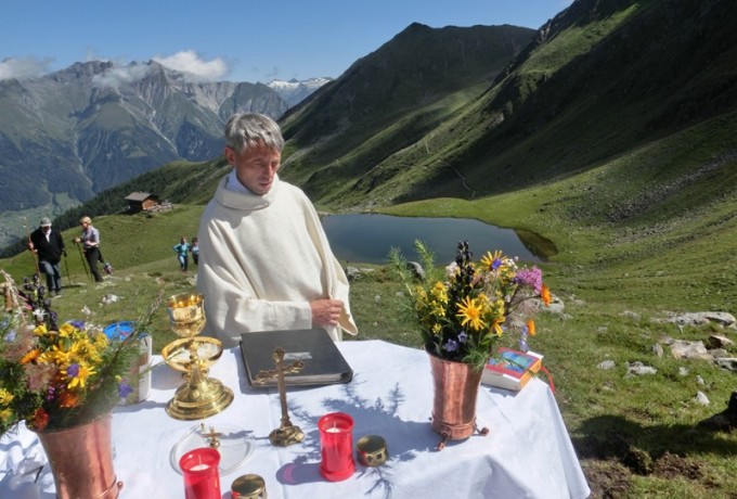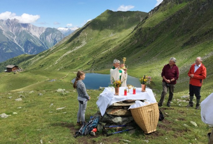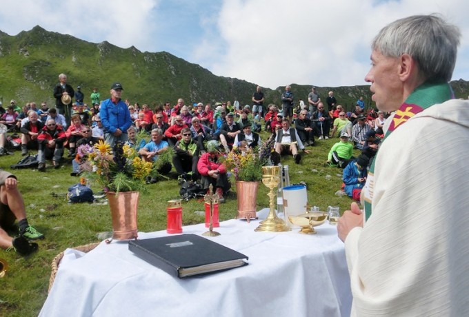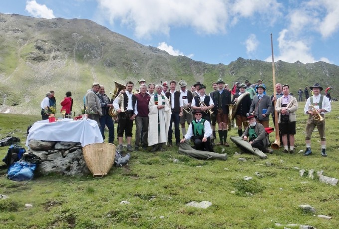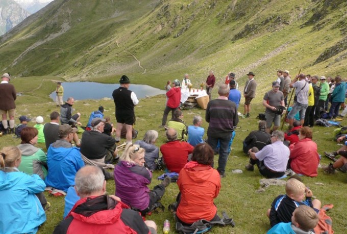 Am Sonntag war der Himmel dann strahlend und wolkenlos, für den Höhepunkt des Jubiläumsfestes, eine Messfeier auf 2.400 Metern Seehöhe mit dem Blindenpfarrer Stefan Müller, der eigens aus der Diözese Limburg anreiste, gemeinsam mit seinem ebenfalls blinden Bruder. Die Weisenbläser und die Stimmen des Virger Männerchores gaben dieser Bergmesse die besondere Note und den feierlichen Rahmen. Blinde und sehbehinderte Menschen nahmen neben vielen Einheimischen und Sommergästen an diesem einmaligen Erlebnis teil, einer Veranstaltung „der ganz anderen Art“, im Einklang mit der Natur und der Schöpfung, oder wie es ein Teilnehmer formulierte, „gleichsam ein Atmen der Seele in unserer hektischen Zeit“.