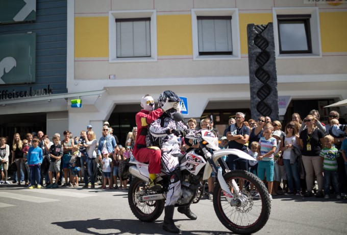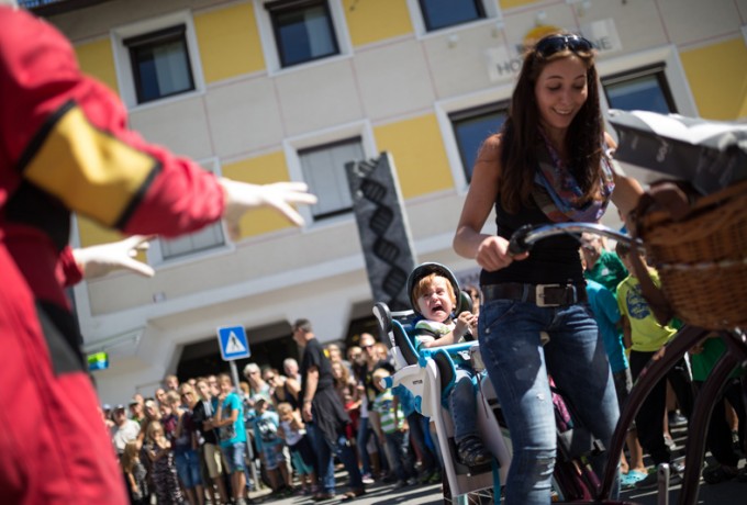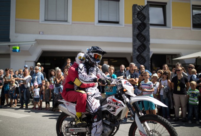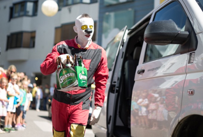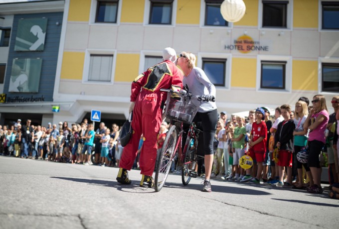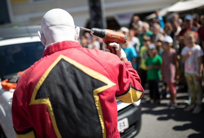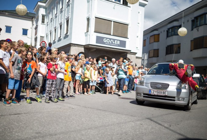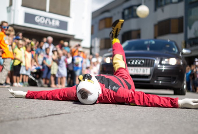 Die Verdeckung eines Autos landete auf der Windschutzscheibe des nachfolgenden und Fahrer mit Hut waren bald ohne Kopfbedeckung. Aus den Fahrradkörben kugelten die Handtaschen und Motorradfahrer hatten plötzlich einen Passagier hinter sich sitzen – blöd nur, dass ihnen dieser die Augen zuhielt. Hundertstelsekunden nachdem er Autos weitergewunken hatte, lag der chilenische Clown schon am Boden vor ihnen und spielte den Verletzten. Besonders arm war der Lieferant einer Lienzer Bäckerei, dem Murmuyo eine Getränkekiste aus dem Lieferwagen stahl und die vollen Flaschen unter dem Publikum verteilte. Was der Fahrer wohl seinem Chef erzählte? Vielleicht: "Ein Clown hat mich überfallen!" Bei einem anderen hatte er weniger Glück, denn es gab nur Leergut, aber auch das musste dran glauben.