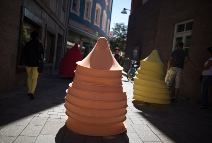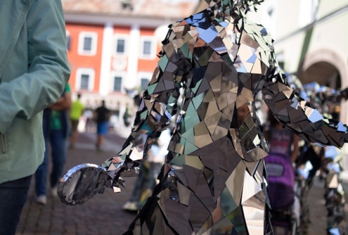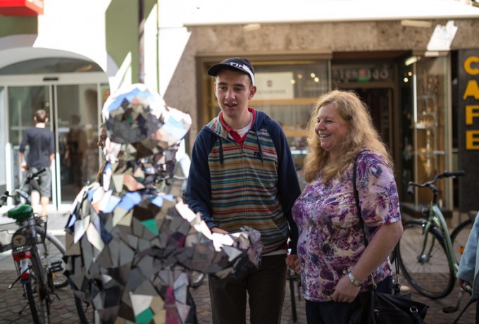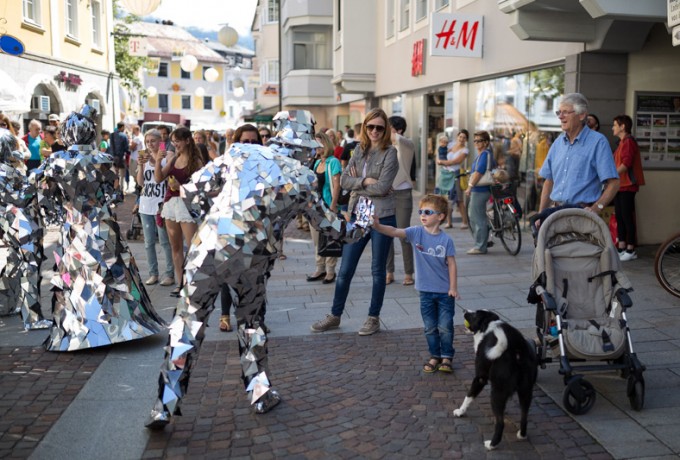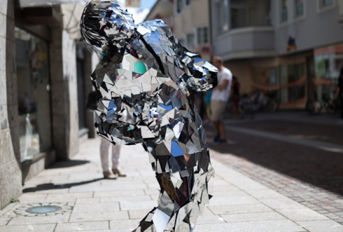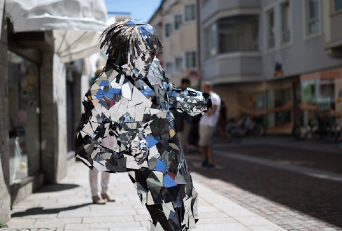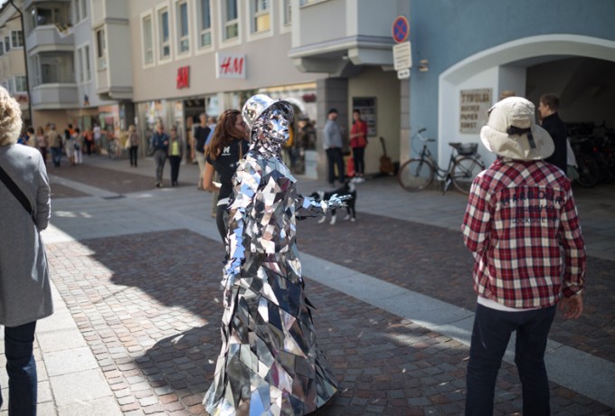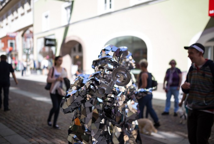 Weniger mit Theater zu tun haben Figuren wie die Mirror Family, die in ihren Kostümen durch die Fußgängerzone flanieren. Als Fotomotiv sind sie mit ihren reflektierenden Gewändern allerdings weithin sichtbar.