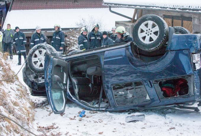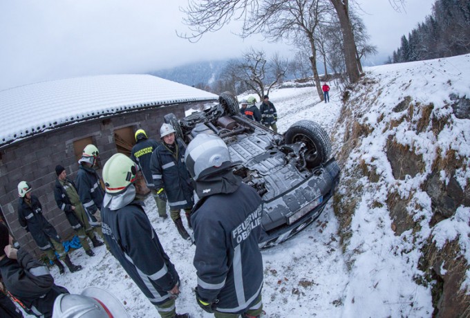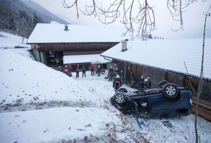 Am 3. Jänner lenkte ein Osttiroler Fahrer gegen 15:20 Uhr seinen PKW in Oberlienz über ein Feld, um den Schlaglöchern auf einem Feldweg auszuweichen. Auf der schneebedeckten und abschüssigen Wiese geriet der PKW ins Rutschen. In der Folge stürzte er über eine zwei Meter hohe Mauer und blieb auf dem Dach liegen.