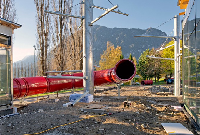 Beginnen wir bei Einbau und Fertigung. Für die Rutsche im Lienzer Hallenbad wird ein eigenes Haus gebaut, der Rutschenturm, der mit der Schwimmhalle durch einen Gang verbunden ist. Auch das Auslaufbecken ist in diesem Gebäudeteil. Das bedeutet für alle Ruhesuchenden: Auch wenn das Vergnügen noch so toll und von manchem entzückten Schrei begleitet ist, der Lärm bleibt im Turm und wird die Badegäste kaum behelligen.