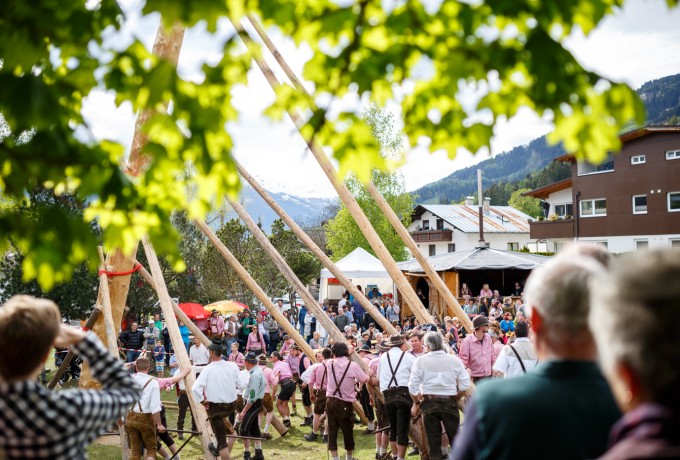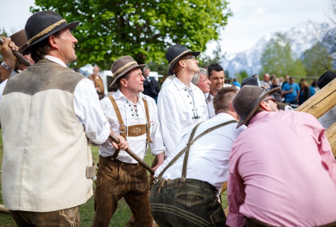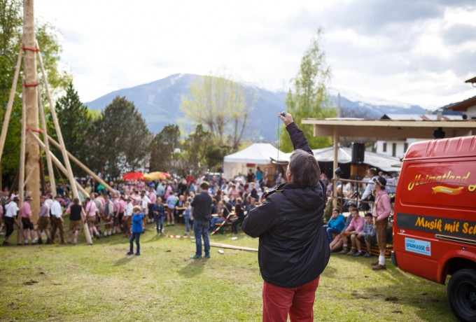 Ein Maibaum wiegt viele Tonnen, ist glatt und wenn er erst einmal in Bewegung gerät eine tödliche Gefahr. Deshalb ist das Aufstellen dieses Baumes mit bloßer Muskelkraft nach der „alten Methode“ nicht nur kräfteraubend, sondern eine Kunst, die einer ganz genauen Choreografie folgt. Jeder der rund 50 Männer, die in Nussdorf-Debant dieses Kunststück auch heuer wieder wagten, hatte exakt einstudierte Handgriffe zu befolgen, damit Zug und Druck, das genau vorgegebene Heben und Stützen perfekt funktionieren. Stundenlang dauert die schweißtreibende Prozedur, begleitet von aufmunternden Rufen des Publikums und echter Volksfeststimmung. Marco Leiter war für Dolomitenstadt dabei.