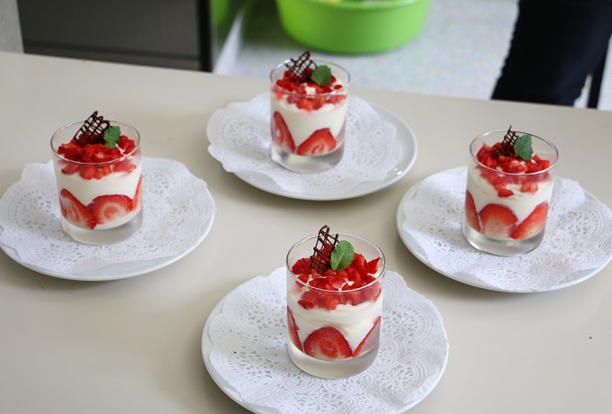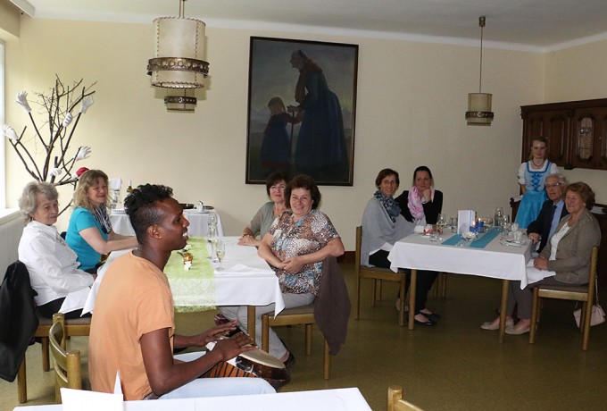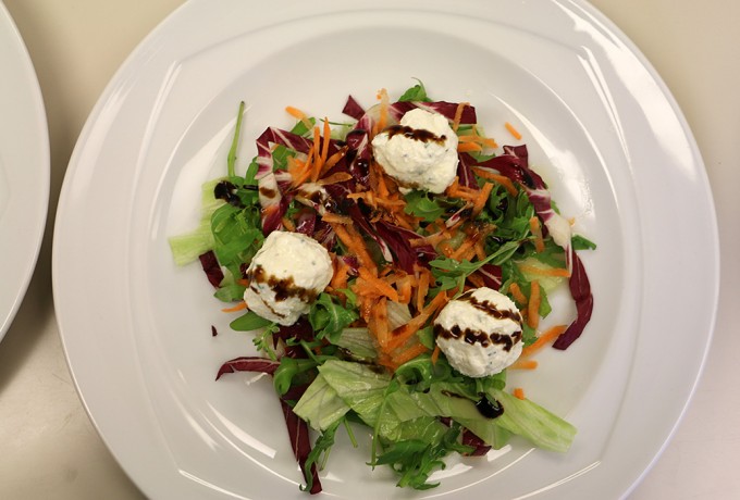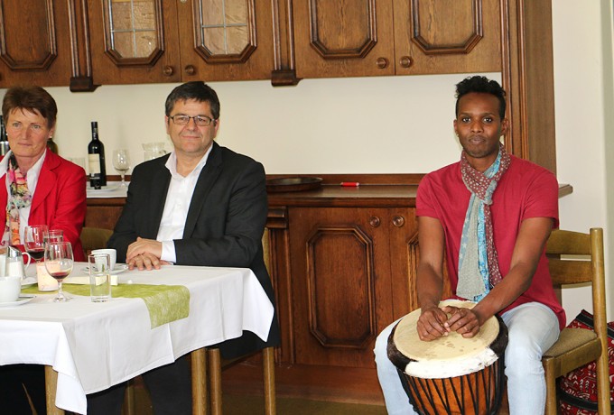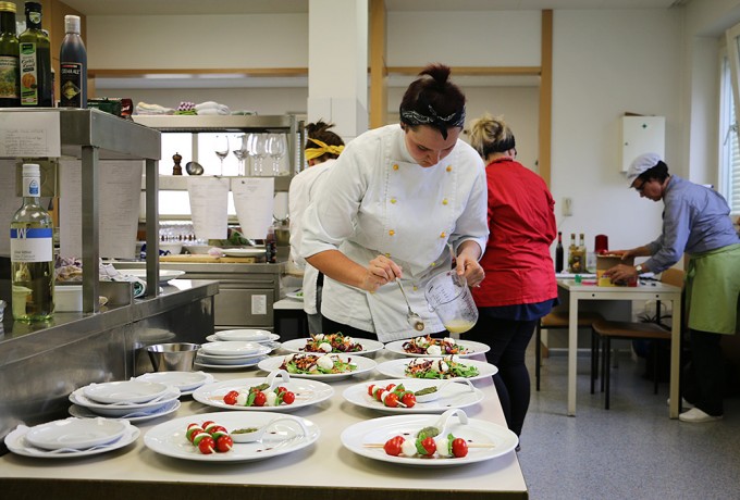 An jedem der vier Tische gab es ein anderes Menü, begleitet vom passenden Wein. Geprüft wurde an mehreren Tagen. Eingeladen waren jeweils Eltern, Förderer der Schule, Medienvertreter, Politiker und auch Direktoren anderer Schulen. Die Fotos von unserem Prüfungstermin schoss Ashi Hussain aus Pakistan, der derzeit im Klösterle Deutschunterricht nimmt. Sein Freund Khalid aus Somalia schaute an manchen Prüfungstagen mit der Trommel vorbei und sorgte für den Rhythmus zwischen den kulinarischen Highlights. Wer regelmäßig dolomitenstadt.at liest, kennt die beiden!