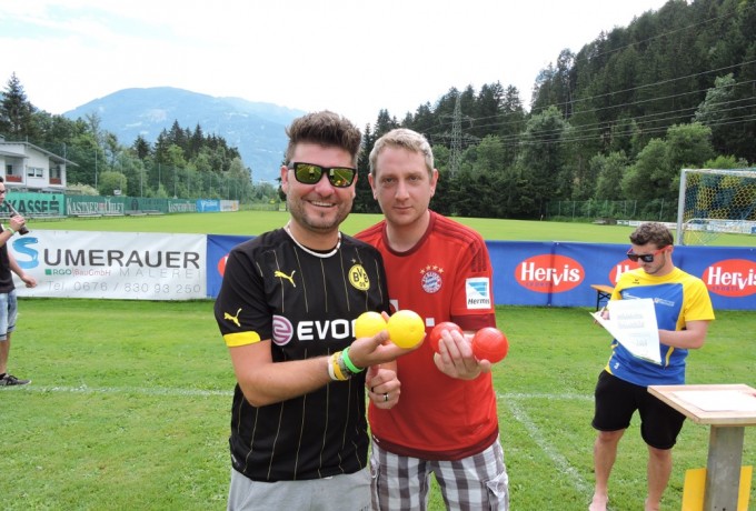 Die „Winkla Buabn“ und „Die Seitenstecher“ verloren im Halbfinale gegen „Die Spritzerbanditen“ und "Die Pfiffigen" und kämpften im kleinen Finale um Platz drei. Aus der Schlussrunde gingen die Banditen Christof Gritzer und Patrick Kircher als Sieger hervor und streiften einen 25-Euro-Gutschein der Pizzeria Leonardo plus Pokal und Urkunde als Preis ein. Die beiden Pfiffigen Matthias Senoner und Philipp Bödenler können immerhin mit einem 15-Euro-Gutschein zum Italiener gehen. Hier sind eine Menge Bilder von diesem spielerischen Nachmittag, fotografiert von Clemens Girstmair und Benjamin Unterwurzacher.