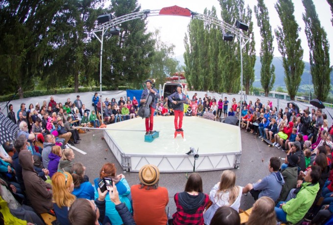 An einem neuen Spielort startete gestern, 26. Juli, die 25. Auflage des Straßentheater-Festivals OLALA in Lienz: Auf dem Parkplatz der Tennishalle hinter dem Dolomitenbad. Passend zum Schauplatz sorgten Barolosolo lustvoll, witzig und musikalisch in einem Planschbecken dafür, dass beim Premierenpublikum kein Auge trocken blieb, bevor die Artisten des Cirque Inextremiste in einen atemberaubenden künstlerischen Dialog mit der Schwerkraft traten. Beide Acts sind heute, 27. Juli, noch einmal zu sehen. Wann und wo erfahren OLALA-Fans ebenso wie alle anderen Programmdetails mit einem Klick auf unserer digitales Echtzeit-OLALA-Programm!