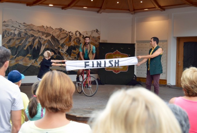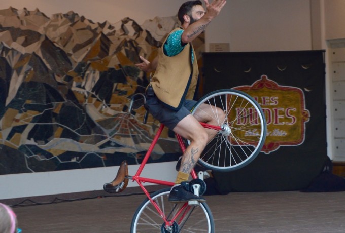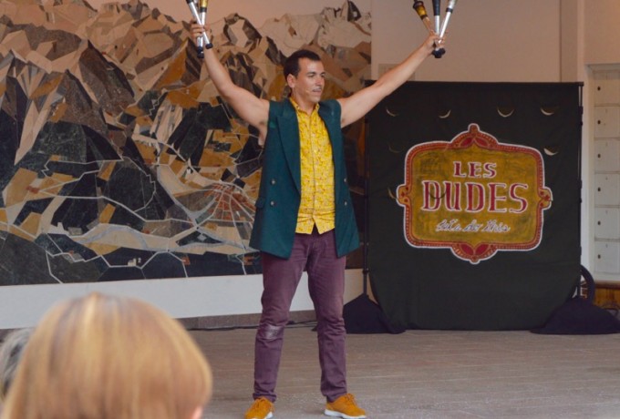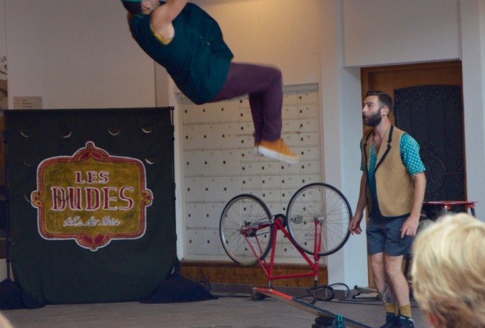 Die Menschen folgen der Musik und erleben den ersten Act des Tages: Les Dudes aus Kanada. Ein junger Mann fährt mit seinem Fahrrad im Kreis, jedoch nicht in der gewöhnlichen Pose. Ein Fuß auf dem Sattel, der andere auf dem Lenker, so zieht Francis Gadbois aus Montreal seine Runden. Dem nicht genug entscheidet sich sein Kollege, Philippe Dreyfuss, ihm ein paar brennende Fackeln zu zuwerfen. Es folgen weitere Aktionen aus der Kategorie „Bitte nicht zuhause nachmachen!“ Es klingt nach einer klassischen Akrobatikvorstellung, doch die beiden Kanadier machen mit einer guten Portion Humor mehr daraus und das Publikum ist zum ersten, aber nicht letzten Mal am heutigen Tage begeistert.