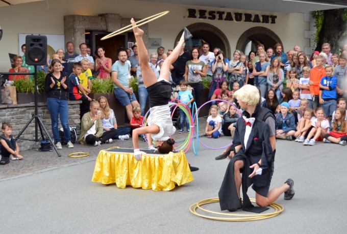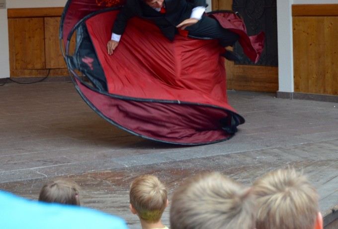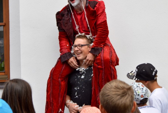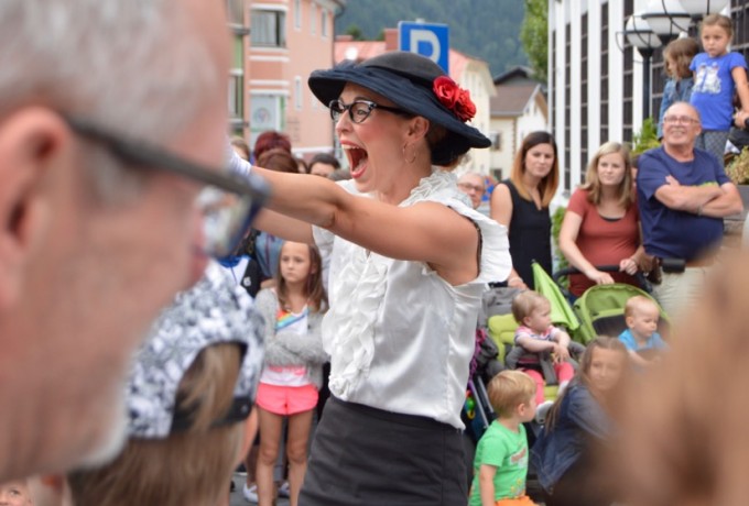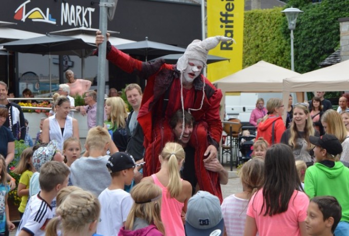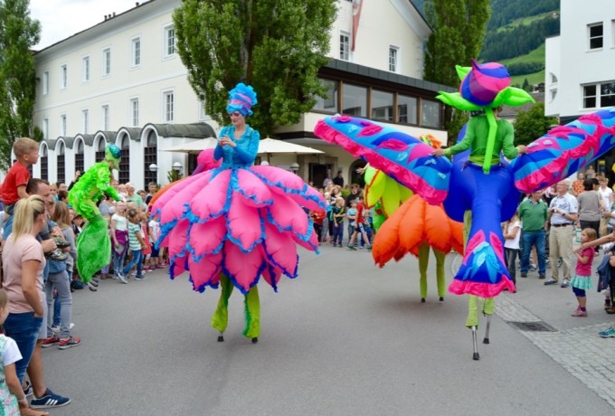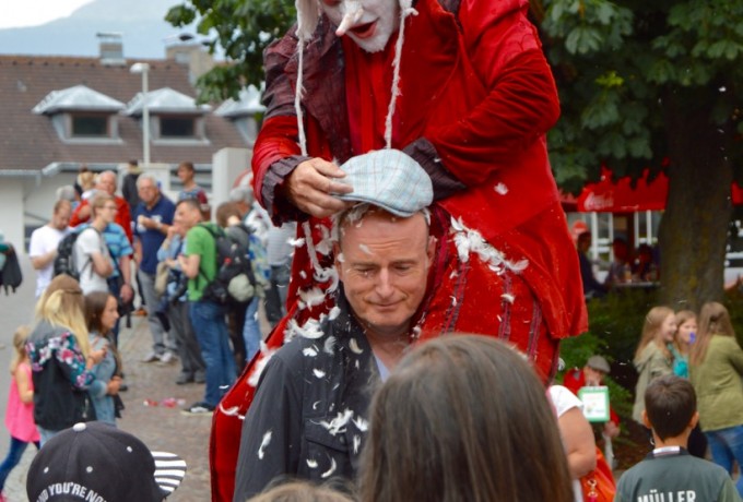 Plötzlich schreitet ein rot gekleideter Riese mit kreideweißem Gesicht in Richtung Matreier Rathaus. Er öffnet die Tür, duckt sich und schon verschwindet er. Ob er es auf den Bürgermeister abgesehen hat? Keine Sorge, nach wenigen Sekunden kommt der Stelzengeher Adam Read aus Deutschland zurück ins Freie. Er treibt jede Menge Schabernack und wirft mit seinem Markenzeichen, einer Hand voll weißer Federn, um sich.