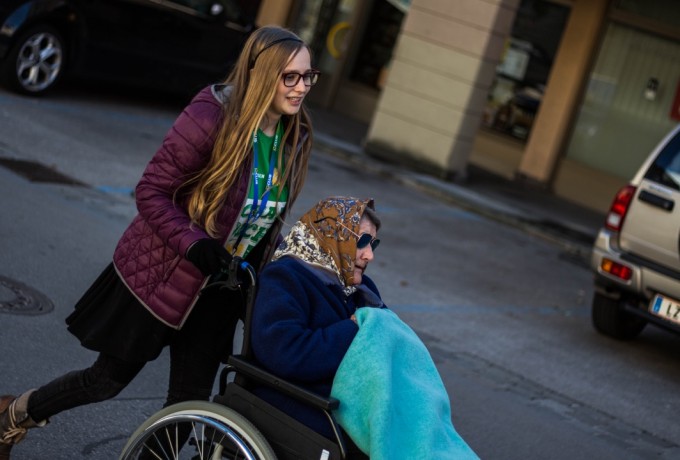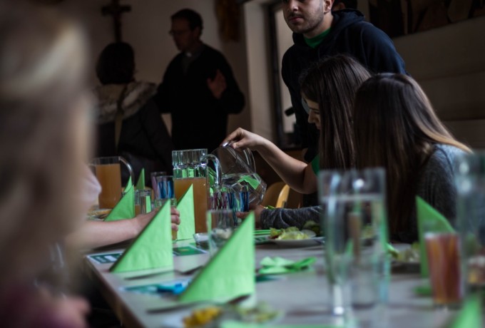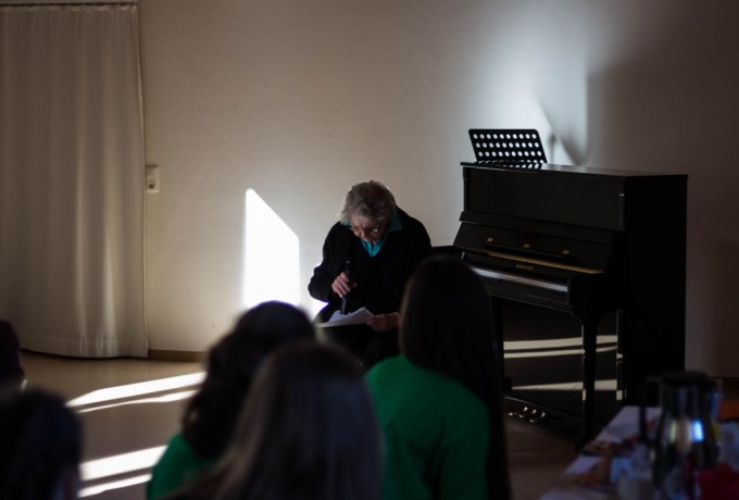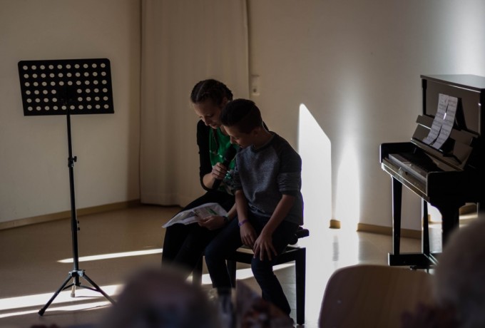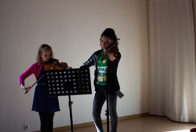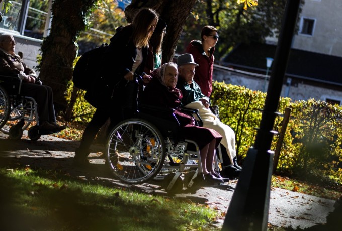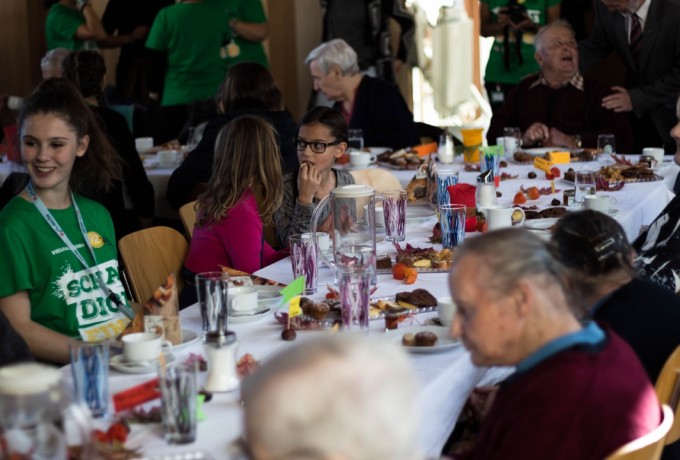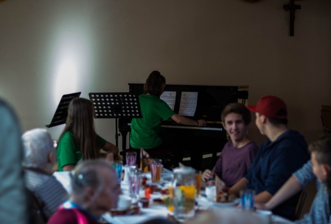Der Konvoi aus Rollstühlen und Begleitern wandert vom Wohn- und Pflegeheim über den Iselkai bis zur Pfarre, wo die Gäste bereits erwartet werden. Neben den am Vortag zubereiteten Köstlichkeiten wird den Anwesenden auch ein abwechslungsreiches Rahmenprogramm geboten. Einige kleine Stücke am Klavier und auf der Geige sowie kurze Geschichten und Gedichte werden den Gästen vorgespielt und vorgelesen. Am Ende ergreift sogar die mehrmalige Poetry Slam Gewinnerin Frieda Kleinlercher das Mikrofon und gibt einige ihrer Texte zum Besten, die für viele Lacher im Publikum sorgen.