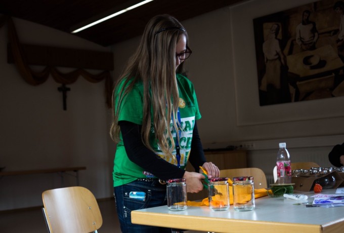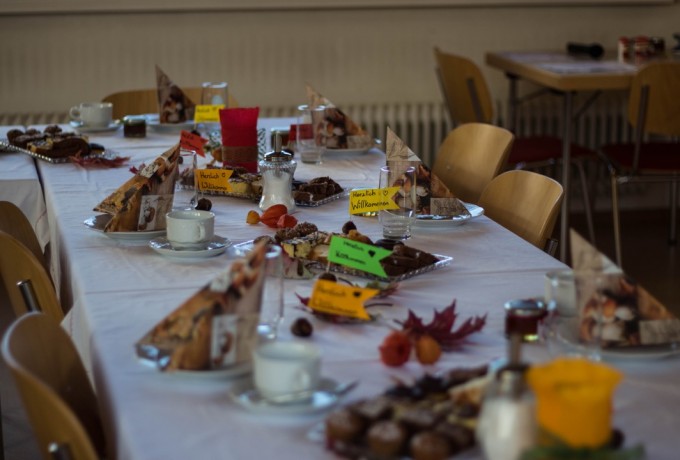 Als wir die Stufen zum Pfarrsaal hinaufsteigen, schlägt uns schon eine Duftwolke, die nach frisch gebackenem Kuchen riecht, entgegen. Während die einen hier in der Küche süße Köstlichkeiten für die Bewohner und Bewohnerinnen des Wohn- und Pflegeheims zubereiten, basteln die anderen an Tischdekoration und stellen ein Rahmenprogramm für den Besuch der Gäste zusammen.