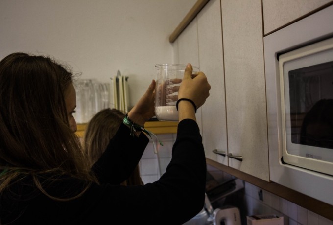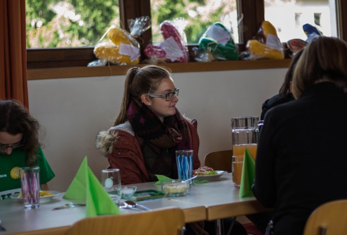 Nachdem wir uns auch noch aktiv an der Kuchenverkostung beteiligt haben, machen wir uns auf den Weg nach Dölsach. Dort wird im Flüchtlingsheim für das Projekt „Mei Tog“ gedreht. Alle Beteiligten sind voller Elan bei der Sache.