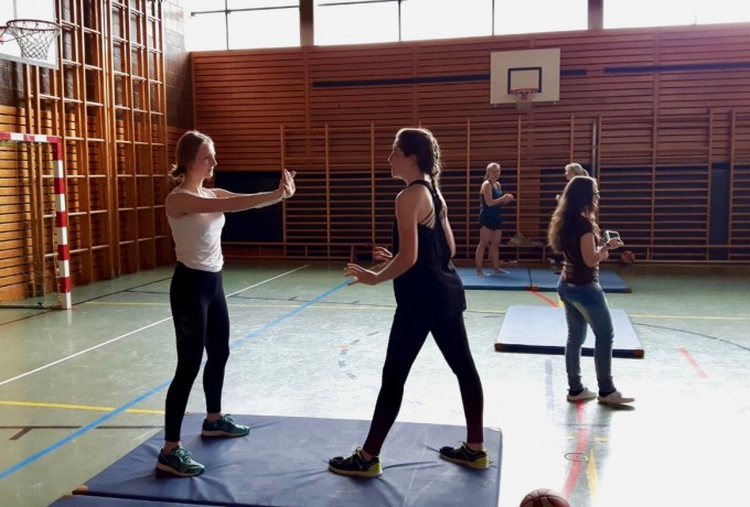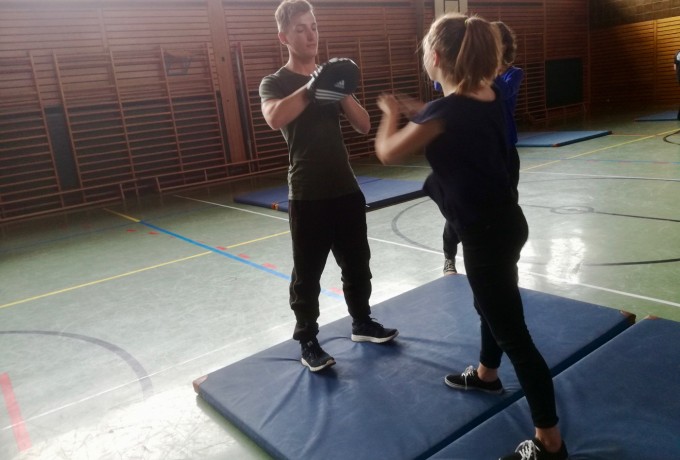 Oberst Rott, der Kommandant des Jägerbataillons 24 in Lienz, weiß wovon er spricht. Er studierte nicht nur Englisch und Sport-, sondern auch Politikwissenschaften, steht seit 30 Jahren im Heeresdienst, hat mehrjährige Auslandserfahrung und betreute auch als Ausbildungsleiter schon viele internationale Friedensstudenten an der Universität Innsbruck. Wie bei dem Projekt zur Friedensforschung in Innsbruck ging es ihm auch bei den Lienzer SchülerInnen im anschließenden mehrstündigen Selbstverteidigungstraining in der Sporthalle nicht, um Schreckensszenarien an die Wand zu malen, sondern auszuprobieren, um Ängste abzubauen, anstatt sie zu schüren. Korporal Kevin Fleiszner aus Sillian unterstützte ihn dabei. Und wie man auf den Bildern sieht, die von den SchülerInnen gemacht wurden, waren alle mit vollem Interesse und Einsatz dabei!