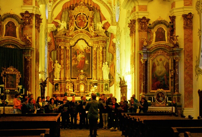 In der Michaelskirche im Zentrum von Innichen, markant wegen ihrer goldenen Figuren an der Außenfassade, hörte man die Klänge des Innichner Stiftchores unter der Leitung von Martin Gasser.
