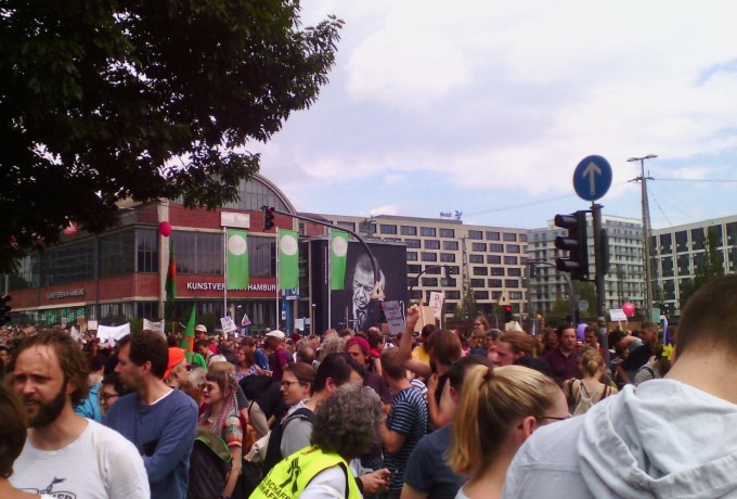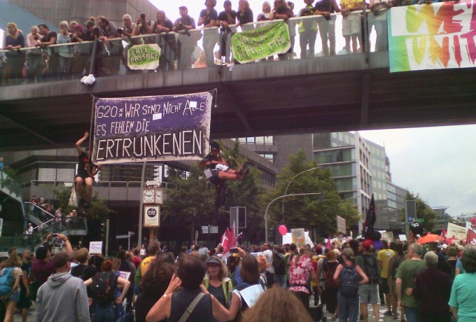 Weil uns das alles stank, weil wir das nicht wollten und weil wir auch wissen, dass Hamburg auch ganz friedlich Protest üben kann, sind wir auch zu einer Demonstration gegangen. Die Auswahl war groß. „Lieber tanz ich als G20“, „G zwanzig Bier holen“ oder „Gay20 Gipfel“ waren nicht unbedingt unser Fall. Wir entschieden uns für „Grenzenlose Solidarität statt G20“ und hatten Glück.