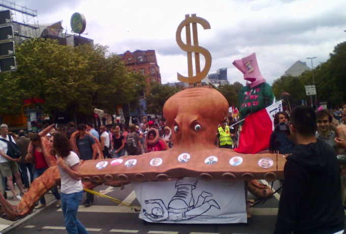 Während neben uns der „GeldScheinheilige Bankratius“ in einer rosaroten Soutane Kapitalismuskritik tanzte, erlebte ich gelebten Kapitalismus, als mir für recht viel Geld ein an sich sehr billiges wie warmes Bier von einem Straßenverkäufer angeboten wurde. Angebot und Nachfrage trafen sich. Wir zogen an der Großen Freiheit vorbei, einem Straßenzug auf St. Pauli, in dem Waffen explizit per Straßenschild verboten sind, und kamen wohlbehalten am Heiliggeistfeld an. Neben uns immer wieder Schilder, auf denen stand, „Mama, es geht uns gut“.