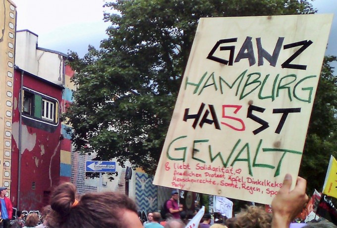 Kein schwarzer Block, freundliche wie müde Polizisten, viele nette, meist lachende Menschen. Nach Zahlen irgendwas zwischen 50.000 und 75.000 Menschen. Laut und leise, bunt und beige, vielfältig. Alte wie Junge, viele Familien mit kleinen Kindern. Eine Horde Clowns, die einen angenehm durchgeknallten Eindruck im Vergleich zu den als Horrorclowns bezeichneten Staatschefs machten. Der Sohn meiner Partnerin hatte ein Plakat gemacht, schrieb „Ganz Hamburg hasst Gewalt“ darauf, und bekam viel positive Resonanz.