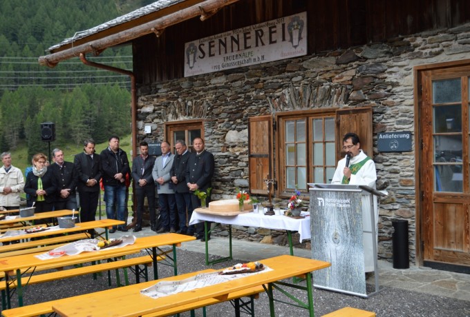 An schönen Tagen ist der namensgebende Berg von den Almwiesen des Gschlösstales aus gut zu sehen, nicht so an diesem Tag. Es herrsche typisches "Taurerwetter“, erklärt Sennerei-Obmann Dietmar Kurzthaler. Wetterfest beginnt Diakon Guillermo Vargas Diaz, Einheimische nennen ihn "Memo", mit der Segnung der Sennerei. Gebete werden gesprochen, Lesungen gelesen und reichlich Weihwasser versprengt, womit der geistliche Teil des Festaktes abgeschlossen ist.