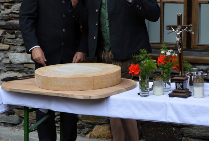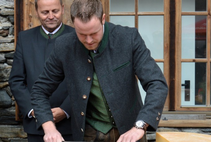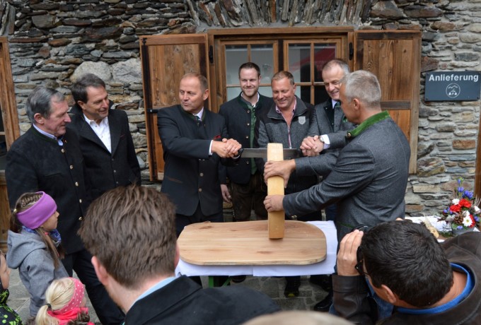 Dann schreitet er zur Tat und hebt den rund 28 Kilogramm schweren Laib in senkrechte Position, damit Landesrat Geisler und Sennerei-Obmann Kurzthaler die alpine Köstlichkeit in zwei Hälften trennen können. Neben den Genannten befinden sich in der Gästeschar auch Landtagsabgeordneter Hermann Kuenz, RGO-Obmann Franz Ganeider, Nationalparkdirektor Hermann Stotter und der frischgebackene Kurz-Kandidat Bernhard Webhofer.