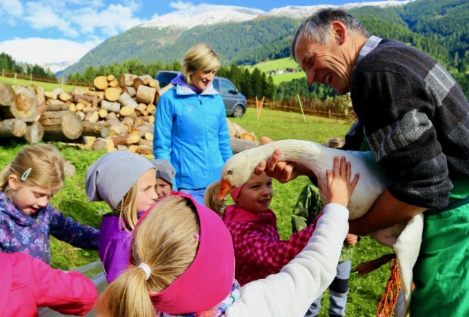Der Anraser Heimatpflegeverein hält nicht nur alte bäuerliche Traditionen aufrecht, sondern versucht diese Qualitäten auch den Jüngsten anschaulich zu vermitteln. Auf Einladung des Vereins besuchten die Kinder der 1. Klasse der Volksschule Anras mit ihrer Lehrerin Magdalena Klammer in dieser Woche den Ehrenfelder-Hof in Unterried und entdeckten dabei alte und zum Teil schon seltene heimische Tierrassen: Tiroler Steinschafe mit ihren neugeborenen Lämmern, steirische Scheckenziegen, Sulmtaler Hühner, steirische Steinhendln, österreichische Landgänse, Warzen- und Haubenenten und ein Cröllwitzer Putenpaar mit Nachwuchs. Vor lauter Freude über den Besuch der Kinder schlug die Pute sogar ein Rad!