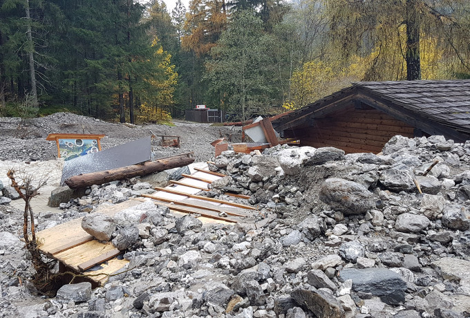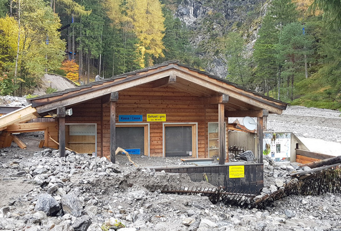 Die Schadenshöhe gehe in die Millionen, besonders betroffen seien die Straßeninfrastruktur, die Verbauungsmaßnahmen von vielen Bächen und Flüssen sowie auch die Jausenstation Galitzenklamm, meldet der Pressedienst des Landes. Von der Zerstörungskraft des Galitzenbaches machte sich der Landeshauptmann dann vor Ort selbst ein Bild. Obwohl die Feuerwehr vorsorglich versucht hatte, mit Holzplanken die Wohn- und Betriebsgebäude zu schützen, wurde die Anlage komplett vermurt, wie die Fotos zeigen.
