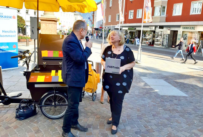 Auf dem Hauptplatz, dem Johannesplatz, dem Egger-Lienz-Platz, in der Rosengasse, am Iselsteg und auf der Rückseite der Stadtbusse werden Wortschöpfungen von Schatz zu lesen sein. In der Stadtbücherei veranstaltete er einen Workshop. Begleitend zur Straßenkunst gibt es Freecards, die zur freien Entnahme aufliegen. Der Startschuss für die Aktion erfolgte am Donnerstag, 19. September, auf dem Johannesplatz, wo Schatz von der Lienzer Bürgermeisterin Elisabeth Blanik begrüßt wurde und sowohl die alte als auch die neue Leiterin der Stadtkultur in Worte kleidete: FASTrein und PROFUNDer. Wir haben mit dem Sprachakrobaten gesprochen: