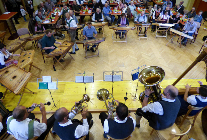 Die beiden Musikgruppen „Hie & Do Musik“ und „ThuLie“ spielten zahlreiche Landler, Märsche, Boarische und Polkas, zu denen die Hauptakteure mit Begeisterung in die Saiten hämmerten. Der Ablauf sieht dabei wie folgt aus: Das jeweilige Stück und seine Tonart wird von der Musikgruppe angesagt, dann wird aufgespielt und alle „Brettler“ spielen mit. Es entsteht eine rauschende Klangwolke, die man in dieser Form kaum anderswo zu hören bekommt. Mit dem Stück „Dem Peter zur Ehr“ von Florian Pedarnig wurde der bereits verstorbenen Hackbrettbauer und Hackbrettspieler gedacht.