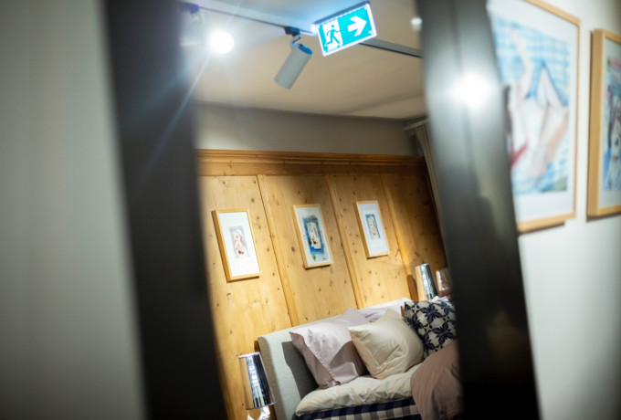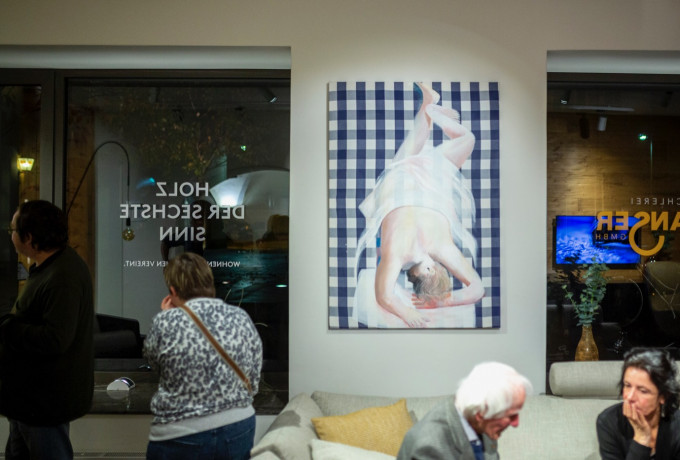 Die Villgrater Edeltischler zeigen dort nicht nur ihre eigenen Möbelkreationen, sondern auch Betten des skandinavischen Herstellers Hästens, die Michael Hedwig zu einer Bildserie über das Schlafen inspirierten. Er zieht dieses Thema so konsequent durch, das nicht nur das typische weißblaue Karo der Hästens Bettbezüge zur visuellen Textur seiner erotisch träumerischen Schlafaquarelle wird. Die originale textile Bespannung mutiert teilweise sogar zum Maluntergrund. Zwei Bilder hat der Künstler mit Acrylfarbe direkt auf Hästensstoffen realisiert.
