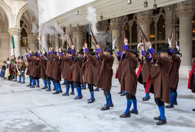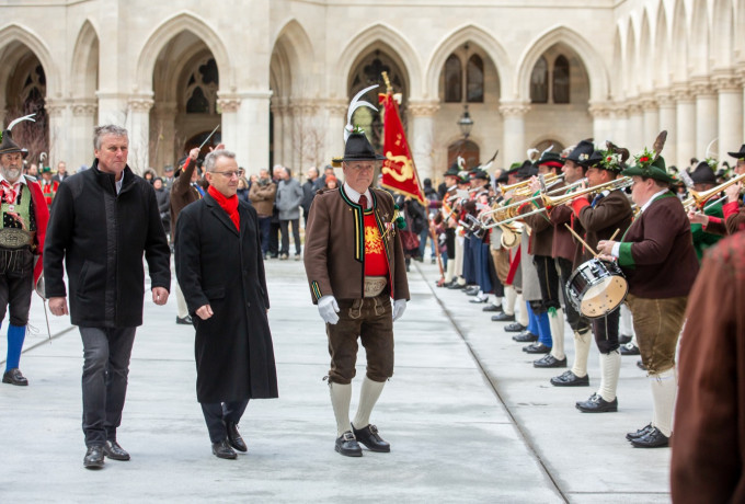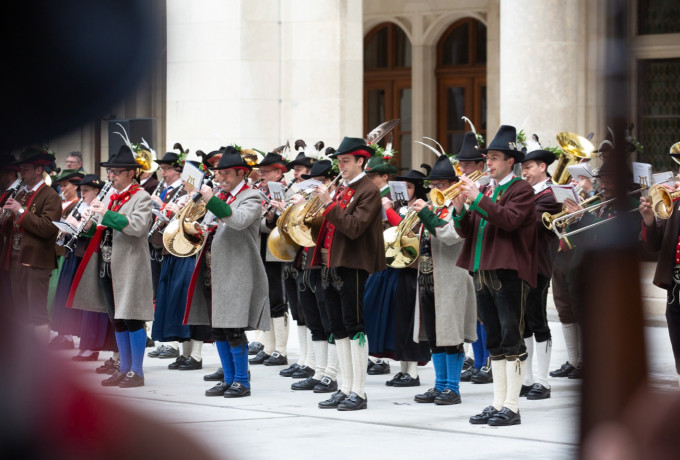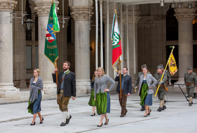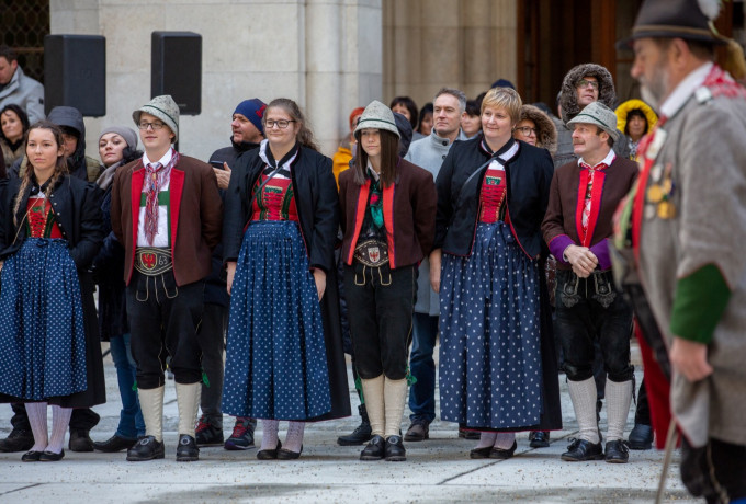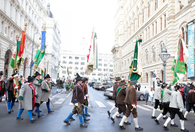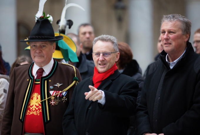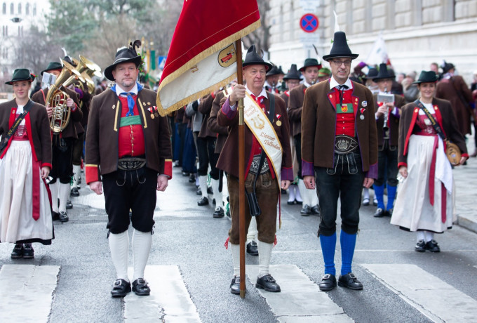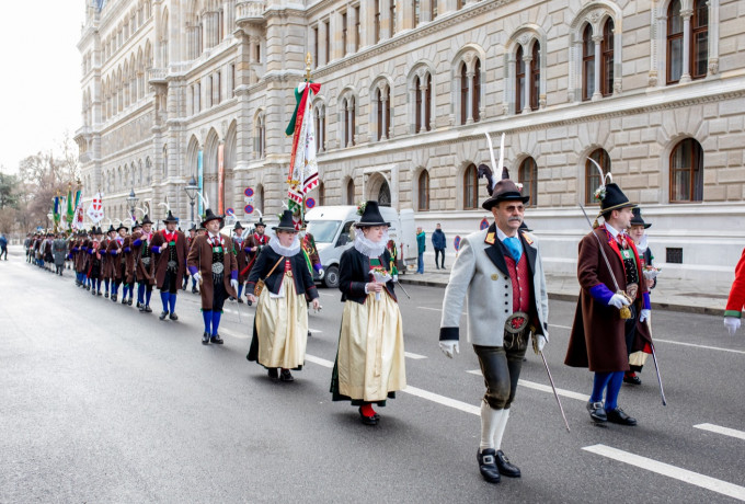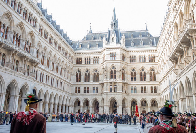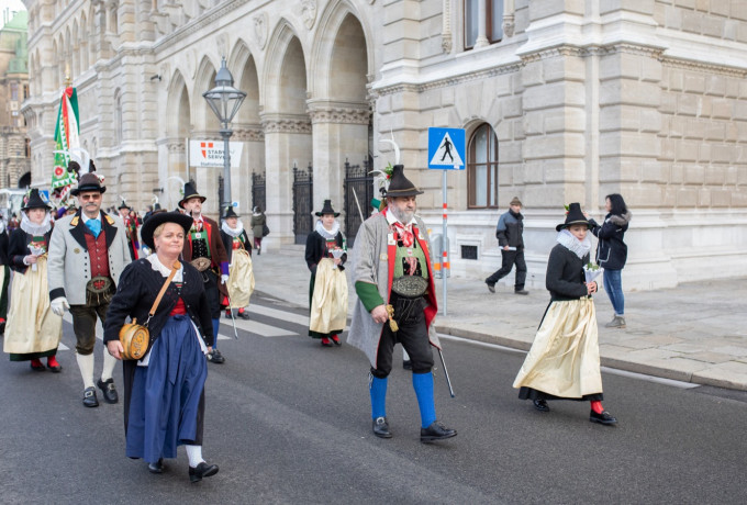Der Tirolerball geht zwar erst am Abend über die Bühne, doch die Abordnung aus dem Lienzer Talboden absolvierte bereits am Samstagnachmittag einen bunten und lautstarken Auftritt vor dem Wiener Rathaus. Hausherr Michael Ludwig ließ sich durch Landtagspräsident Ernst Woller vertreten und der staunte nicht schlecht über die Stärke und Vielfalt der angerückten Trachtenformationen, angeführt vom Dölsacher Bürgermeister Josef Mair, der als Obmann des Planungsverbandes Grüße aus Osttirol überbrachte.