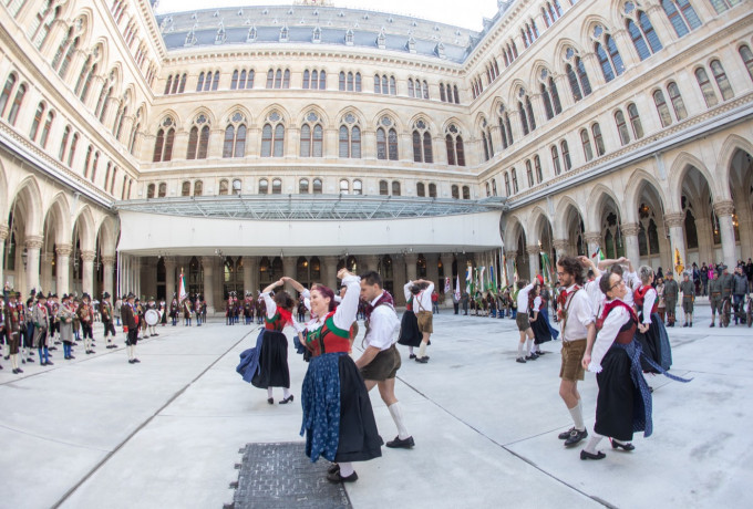 Es wurde geschossen und aufgespielt wie zu Hause, bevor sich die Formationen für das Highlight der Wienreise rüsteten, den Ball in den Hallen des neugotischen Prunkbaus an der Ringstraße. Platz für einen Ball der Superlative bietet das Wiener Rathaus jedenfalls genug. Es steht auf 19.592 m² Grundfläche, hat eine Gesamtnutzfläche von 113.000 m², ist 152 Meter lang und 127 Meter breit. Die 1.575 Räume haben 2.035 Fenster. Der Festsaal des Rathauses ist 71 Meter lang und 20 Meter breit, er wird von zahlreichen Nebenräumen flankiert. Rund 800 Veranstaltungen im Jahr werden im Zentrum der Wiener Stadtverwaltung abgewickelt.