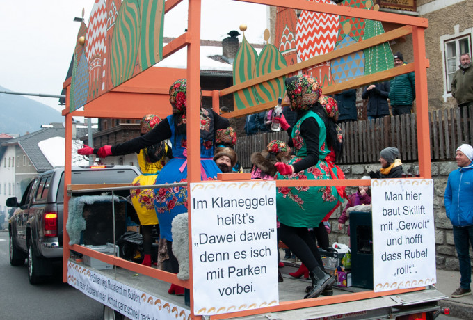 Zahlreiche aktuelle Themen aus Osttirol und der ganzen Welt, wie etwa die neue Regierung, Greta Thunberg und der Klimawandel, das Rauchverbot und der Dolomitenlauf wurden aufs Korn genommen. Auch die Eurofighter machten keinen Bogen um die Marktgemeinde im Oberland und so wurde mithilfe der Jets und eines Polizeihubschraubers während des gesamten Umzuges der Luftraum über Sillian „überwacht“.