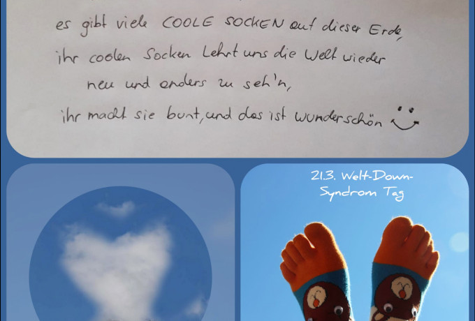 Unterschiedliche Menschen machen das Leben bunt, interessant und schön. Am 21. März ist Welt-Down-Syndrom Tag. Aus diesem Anlass möchten wir aufzeigen, dass auch Menschen mit Trisomie 21 coole Socken sind. Wer der gleichen Meinung ist, ist herzlich eingeladen hier als Kommentar Fotos seiner bunt besockten Füße zu posten.“