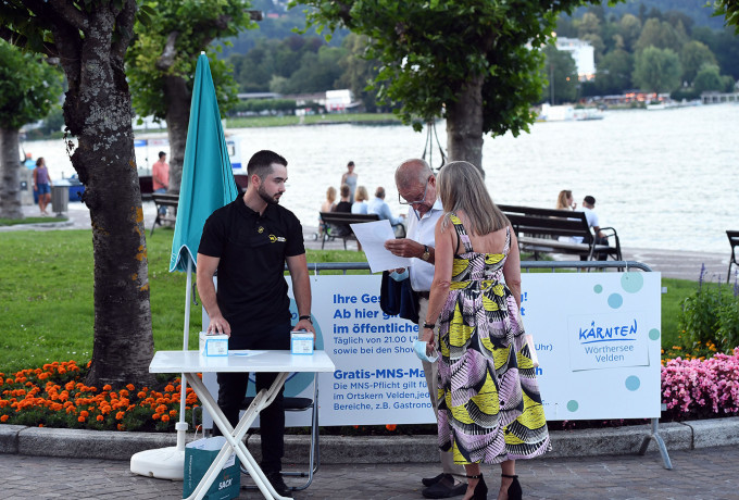 Völlig unspektakulär ist am Freitagabend in Velden am Wörthersee der Auftakt für die Maskenpflicht auf der Flaniermeile und der Seepromenade erfolgt. Der Tourismusort war ausnehmend gut besucht, an den Enden der Begegnungszone verteilten Security-Mitarbeiter Gratismasken. Die Urlauber befolgten die Vorgaben aber nur teilweise.