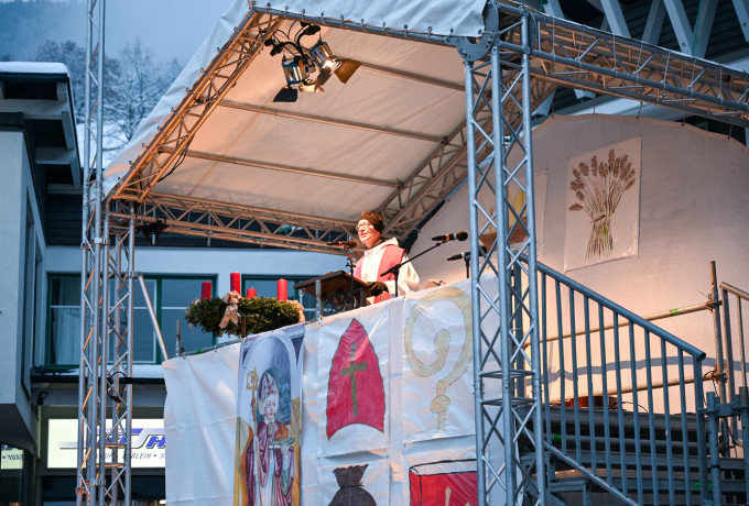 Der Bärtige spannte die Kleinen auch nicht lange auf die Folter und spazierte mit seinen Engeln schon nach wenigen Minuten an den Feuerschalen vorbei auf die Bühne. Er wandte sich mit einer kurzen Rede an die Gläubigen und nach einigen Liedern und der Verabschiedung durch Dekan Troyer gab es für die Kleinen noch ein Geschenk vom Nikolo, ehe starker Schneefall einsetzte und den Parkplatz rasch leerfegte. Wie schon bei der Premiere im Mai sprang auch bei der zweiten Auflage trotz blecherner Trennwände und klirrender Kälte der Funken über.