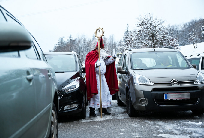 Auf dem Parkplatz standen Dutzende Autos dicht an dicht. Die Motoren wurden abgestellt, in den Innenräumen der Fahrzeuge lief das Radio und von den Rücksitzen blickten Kinder neugierig durch die beschlagenen Fensterscheiben. Sie alle lauschten beim zweiten Drive-in-Gottesdienst den Worten von Dekan Franz Troyer und warteten sehnsüchtig auf den Heiligen Nikolaus, der sich für die Messe angekündigt hatte.